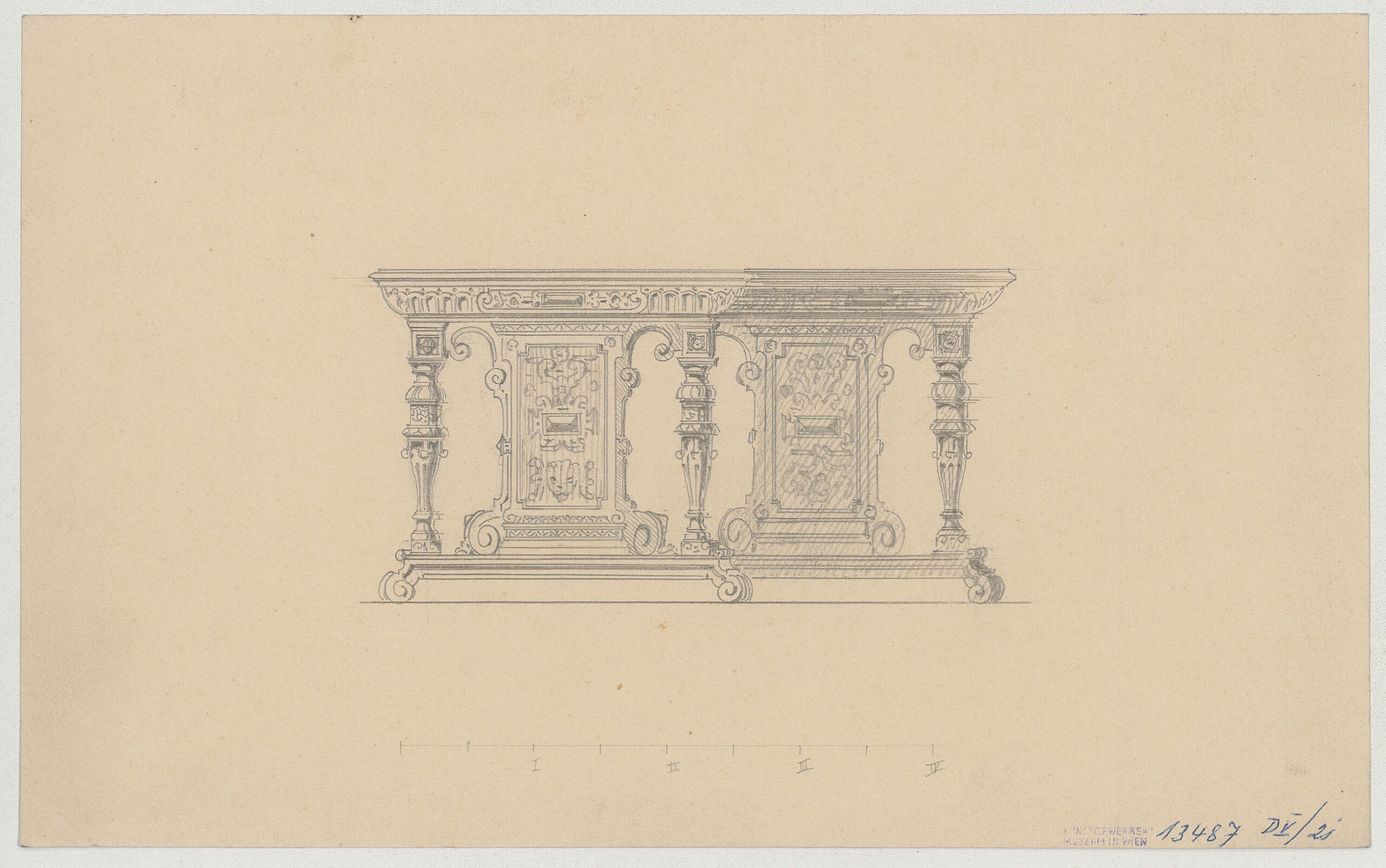 furniture design, Entwurf für einen rechteckigen Tisch mit reichem ornamentalen Schnitzdekor in Form eines ausgeprägten Gesimsbandes an der Deckplatte, Roll- und Blattwerkornamenten, Diamantierungen an der gewölbten Plattenzarge und in den dekorativen Panneaus, die von je zwei Balustersäulen flankiert werden, Heinrich Hof-Tapezierer Backé, MAK Inv.nr. KI 13487-4-5-21