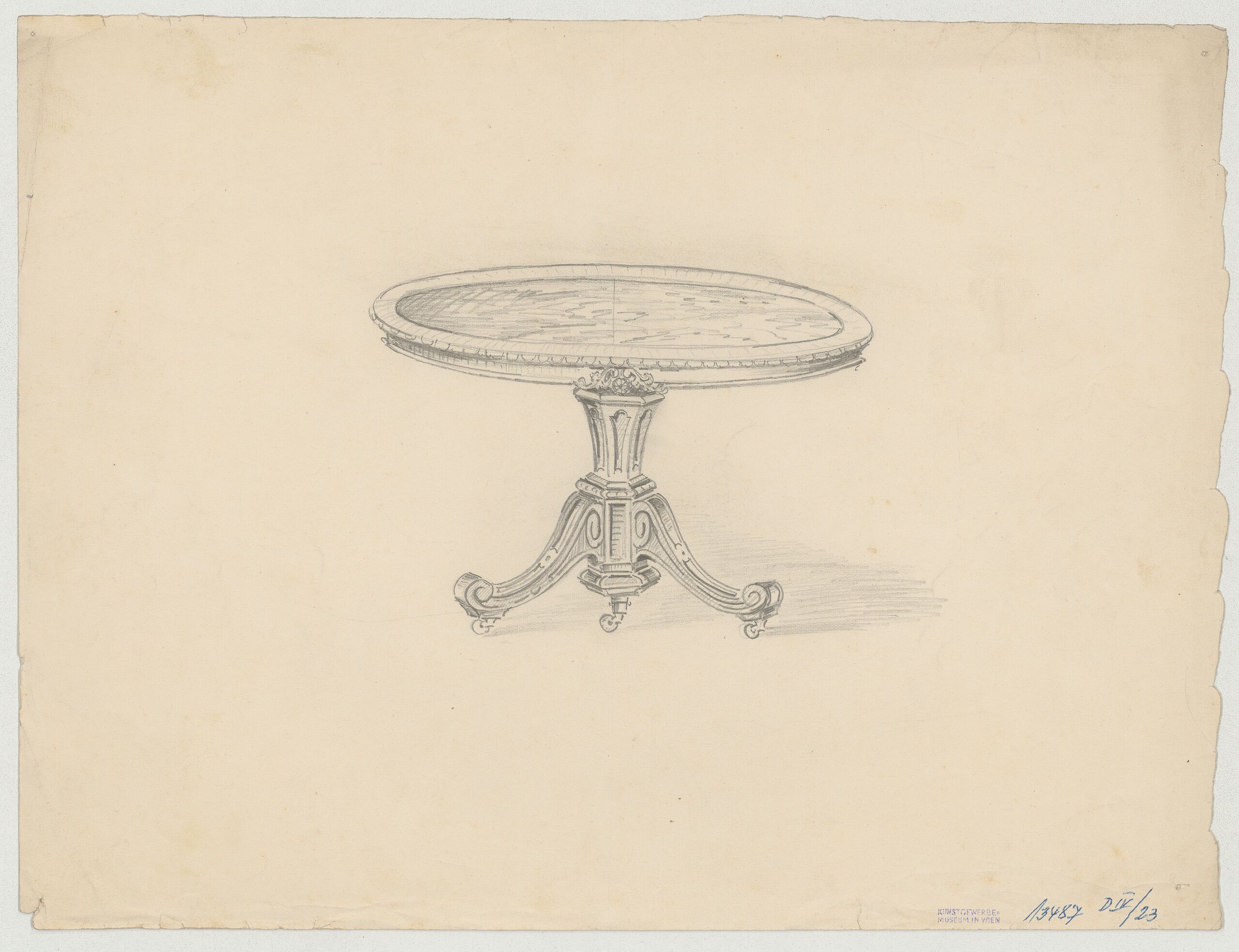 furniture design, Entwurf für einen runden Tisch mit einer Mittelstütze mit volutiertem Dreipass, der, ebenso wie die zentrale Säule, mit kleinen Rollen versehen ist, Heinrich Hof-Tapezierer Backé, MAK Inv.nr. KI 13487-4-4-23