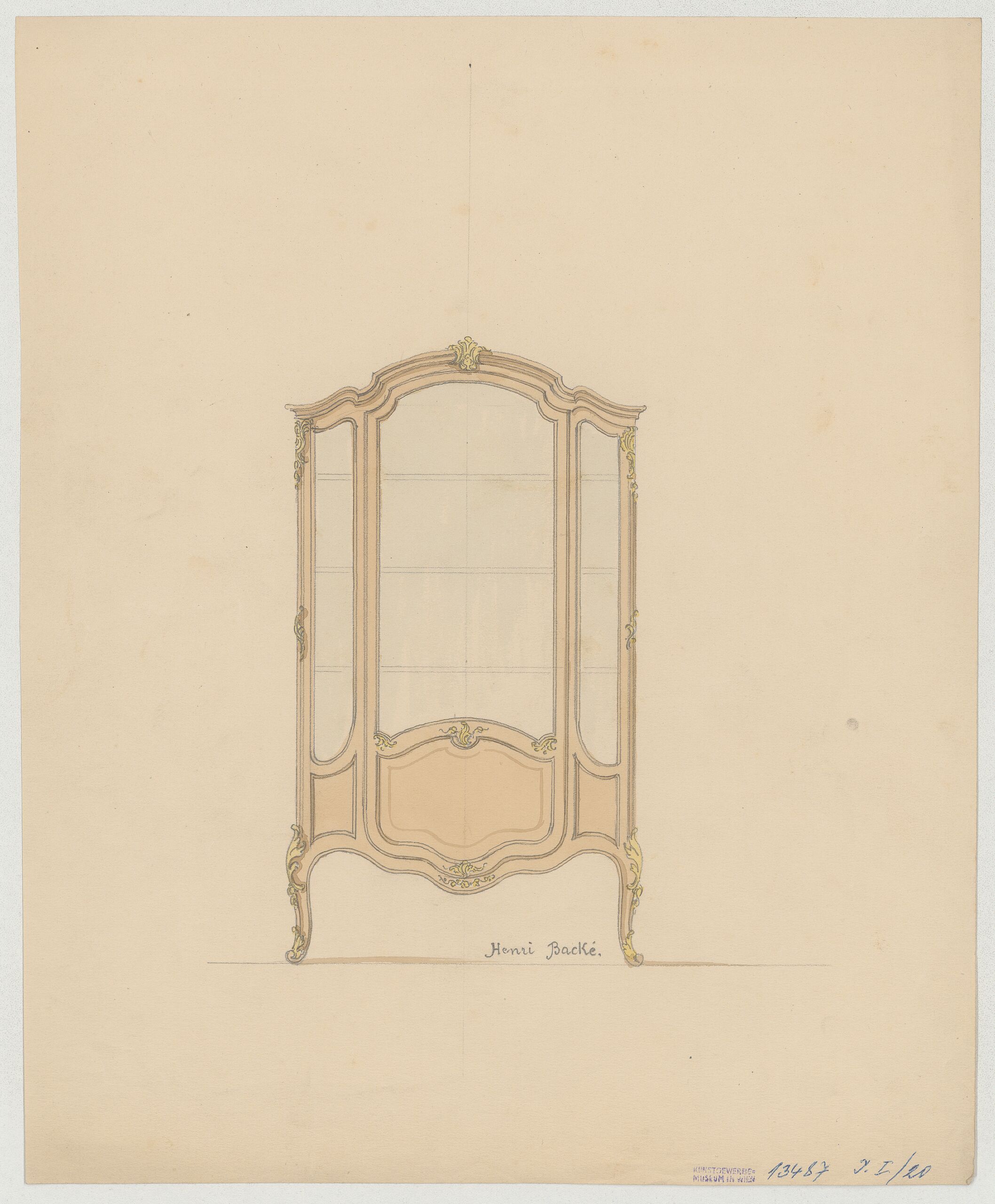 furniture design, Entwurf für einen Vitrinenschrank mit geschweiftem Gesims, einer schwingender Zarge die fließend in die Beine übergeht, formschwingenden Türfüllungen, sowie goldenem Rocailleornament, Heinrich Hof-Tapezierer Backé, MAK Inv.nr. KI 13487-10-1-20