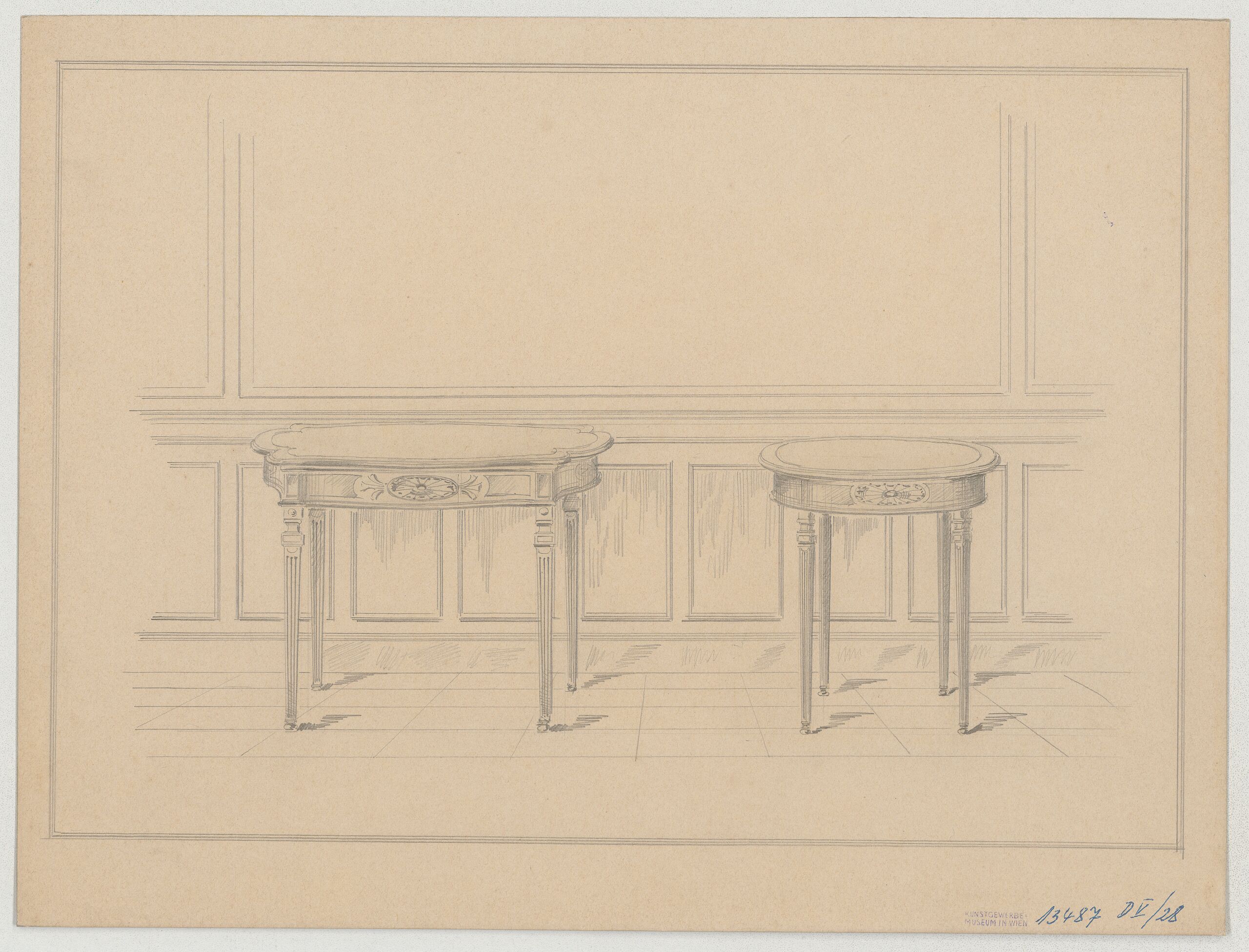 - Entwurf für zwei Salontische mit runder bzw. ovaler Deckplatte, geschwungenem Rahmen und je vier filigranen, kannelierten Beinen, die vor einer angedeuteten Wandvertäfelung dargestellt sind (descriptive title)
