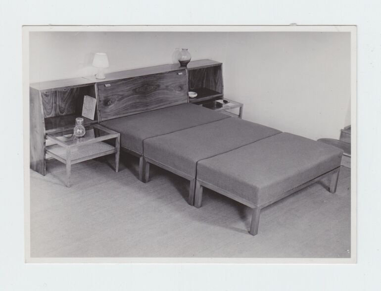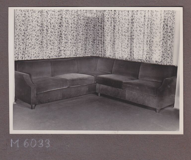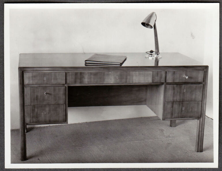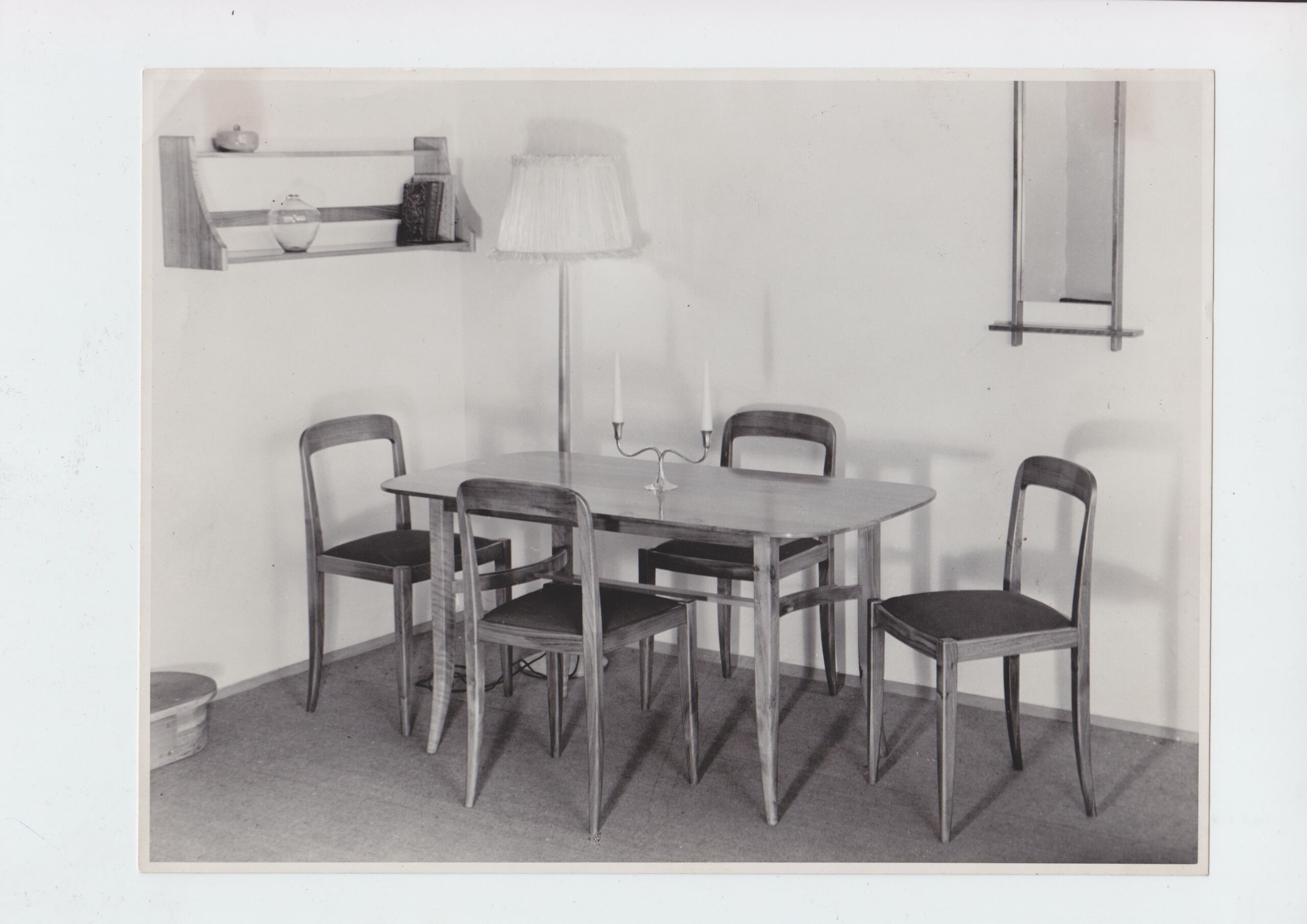 photograph, Esstisch, 4 Sessel, Kerzenleuchter, Stehlampe, Bücherregal, Wandspiegel mit Ablage, Werkstätte Hagenauer, MAK Inv.nr. HAF 2124