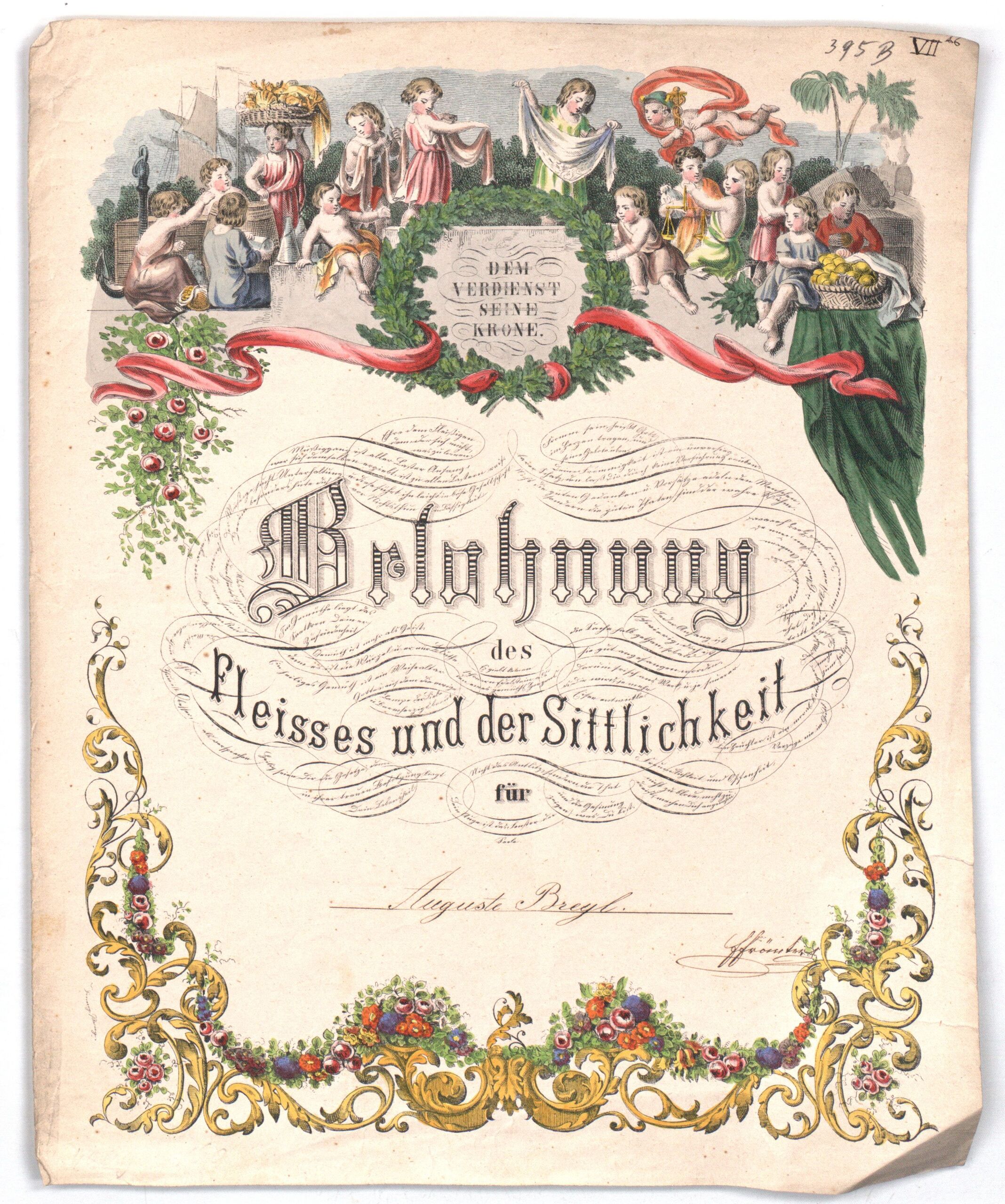 - 作品に記載されている文章: dem / verdienst / seine / krone. / Belohnung / des / Fleisses und der Sittlichkeit / für (Gedruckter Text) / Auguste Breyl. / [...]; VII tes (Feder in Dunkelbraun); Verso: Erhalten bey der öffentlichen Prüfung am 19ten / 7 / 1855 (Feder in Dunkelbraun)