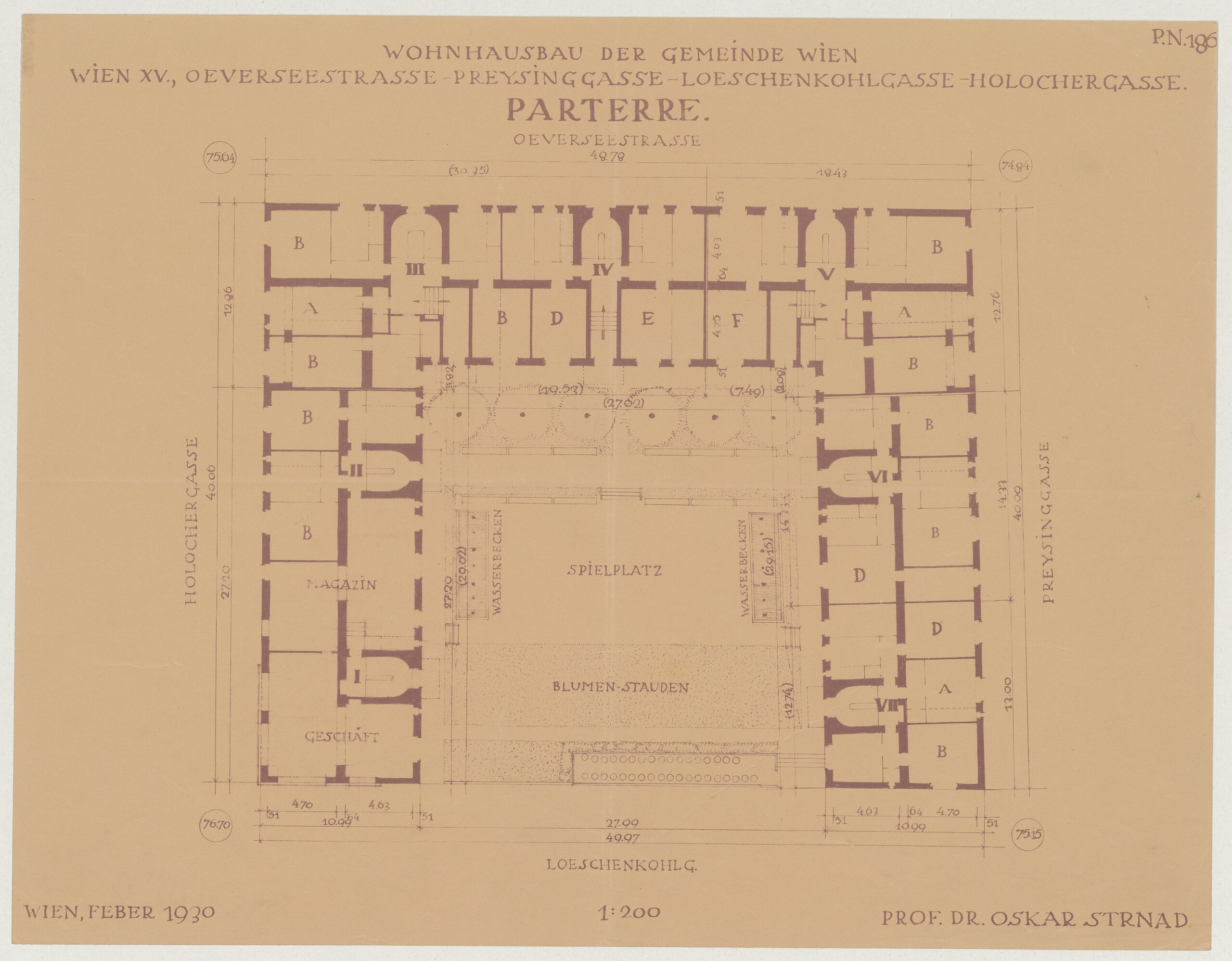 - 作品に記載されている文章 (front) : P.N. 186 / WOHNHAUSBAU DER GEMEINDE WIEN / WIEN XV., OEVERSEEGASSE-PREYSINGGASSE-LOESCHENKOHLGASSE-HOLOCHERGASSE. / PARTERRE. / OEVERSEESTRASSE / 48.78 / 75.64 74.84 / (30.35) 18.43 / III IV V / [...] / MAGAZIN / GESCHÄFT / WASSERBECKEN / SPIELPLATZ / WASSERBECKEN / BLUMEN-STAUDEN / [...] 27.99 / 49.97 / LOESCHENKOHLG. / 1:200 / WIEN, FEBER 1930 PROF. DR. OSKAR STRNAD