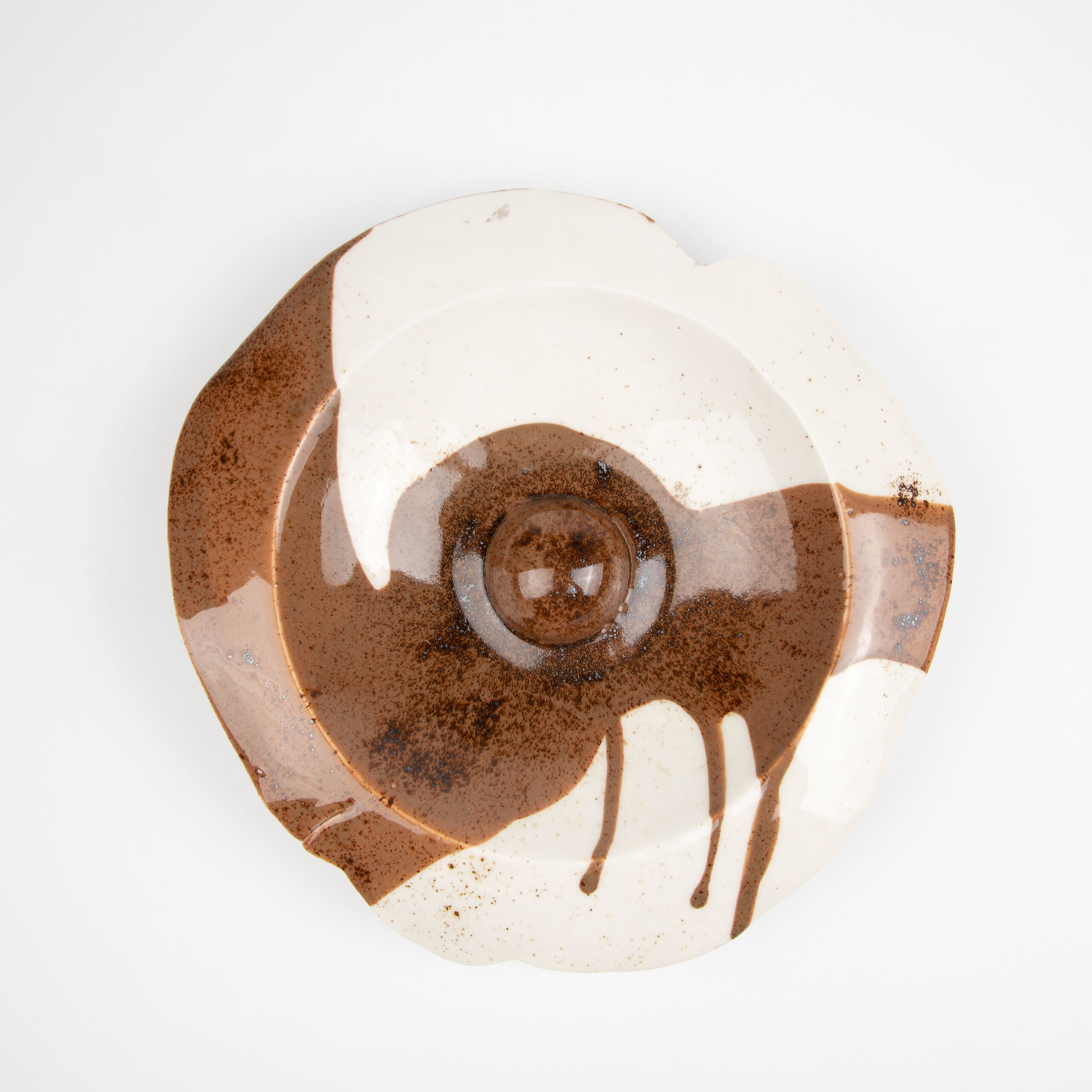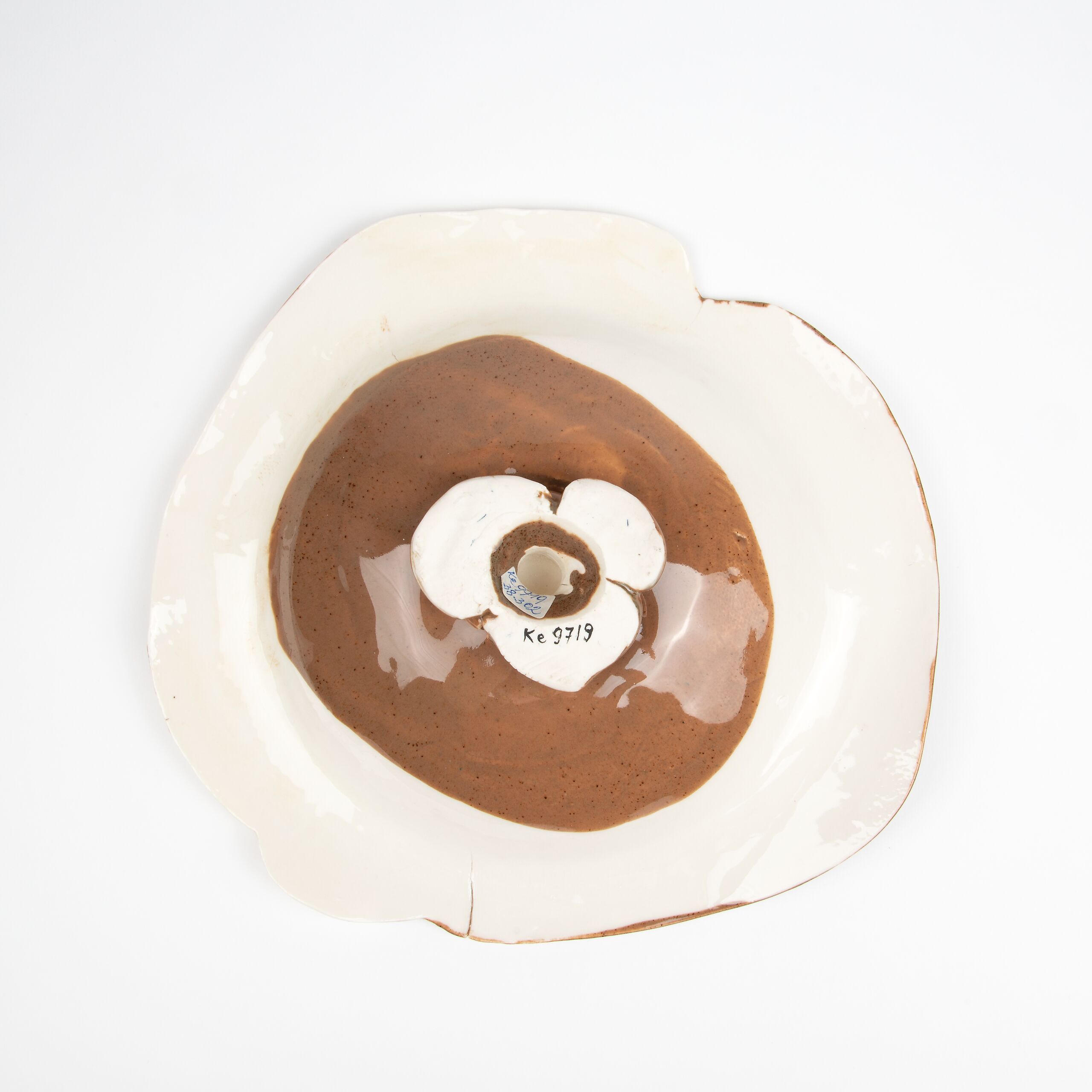 Fußschale, weiß-braun glasiert, der Schalenrand unregelmäßig ausgenommen