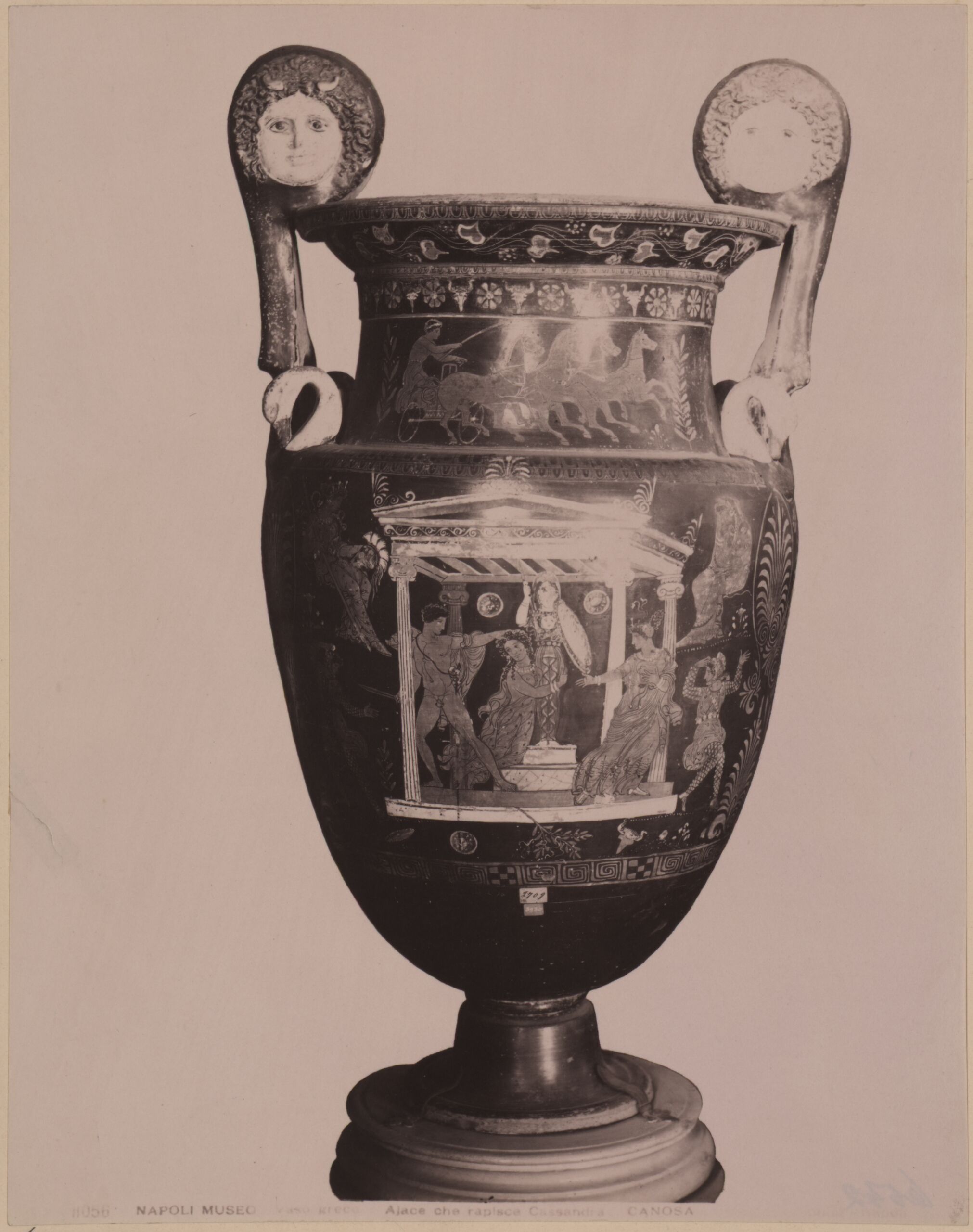 - Text am Objekt: [Untersatzkarton, links unten]: Neapel, Museum.[Untersatzkarton, rechts unten]: Volutenamphora mit Darstellung des Kassandraraubes / durch Ajax.