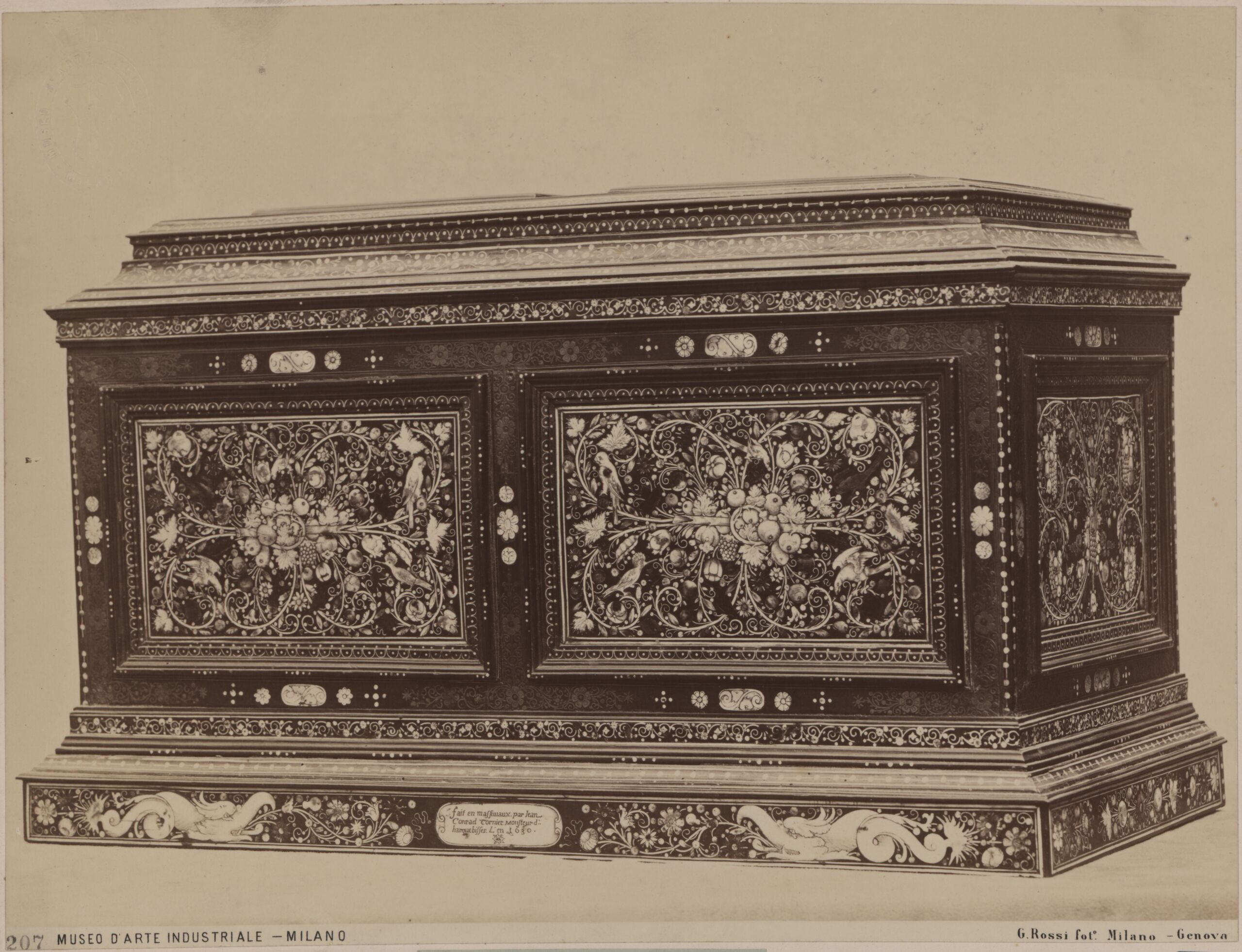 - 作品に記載されている文章: [links]: 207 MUSEO D'ARTE INDUSTRIALE – MILANO [rechts]: G. Rossi fot. Milano - Genova [Untersatzkarton, mittig, geklebt]: Cofanetto in legno - tarsia francese. - Secolo XVII. / largh. 0.60 / Mylius Cav. Federico [Untersatzkarton, rechts]: Französische eingelegte Truhe des 17. Jhdts.