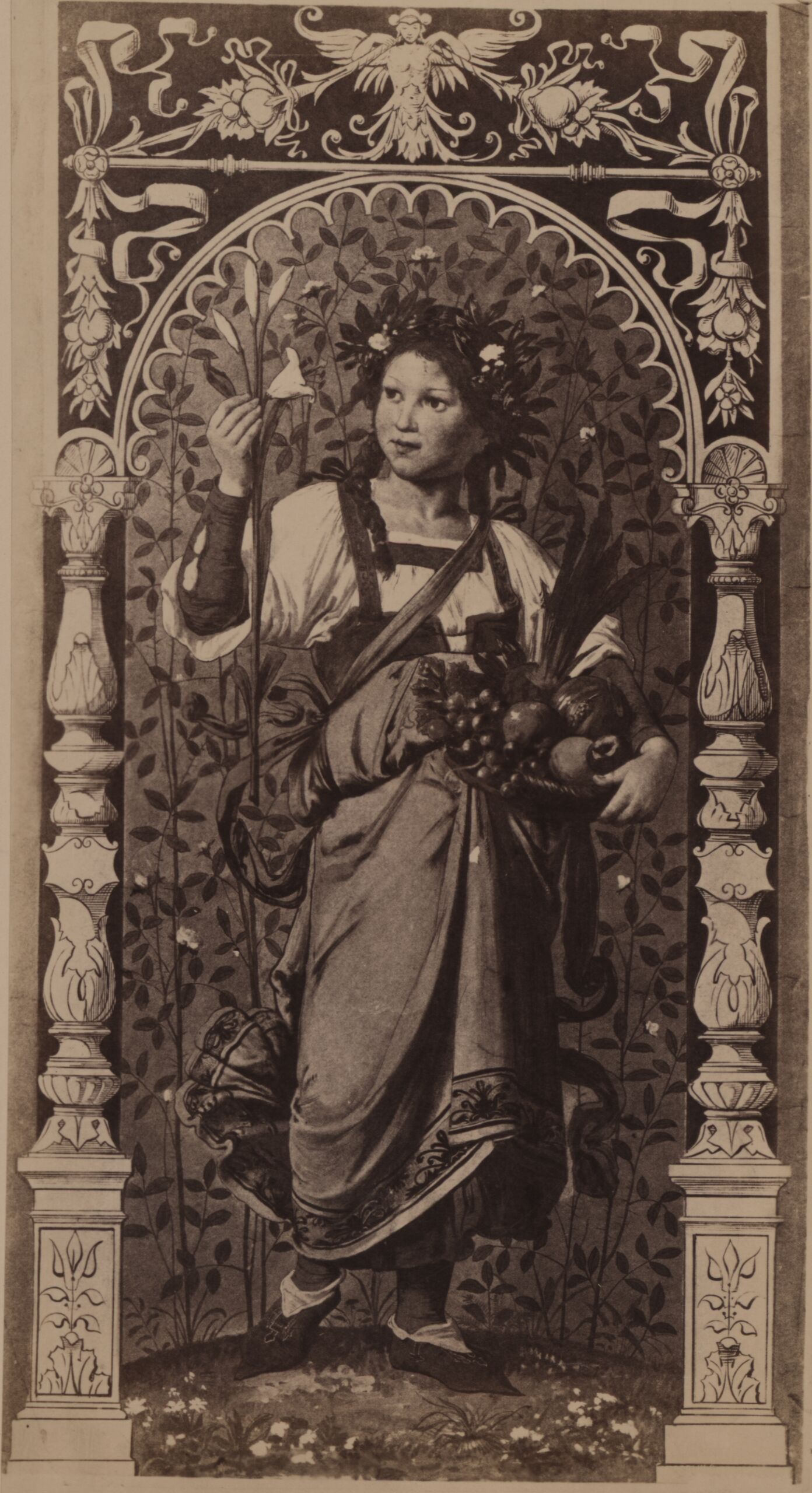 photograph, Fotografie einer Malerei mit einer Figur mit einer Lilie und Obstkorb in den Händen, von Friedrich Geselschap, Friedrich Geselschap, MAK Inv.nr. KI 4108-6