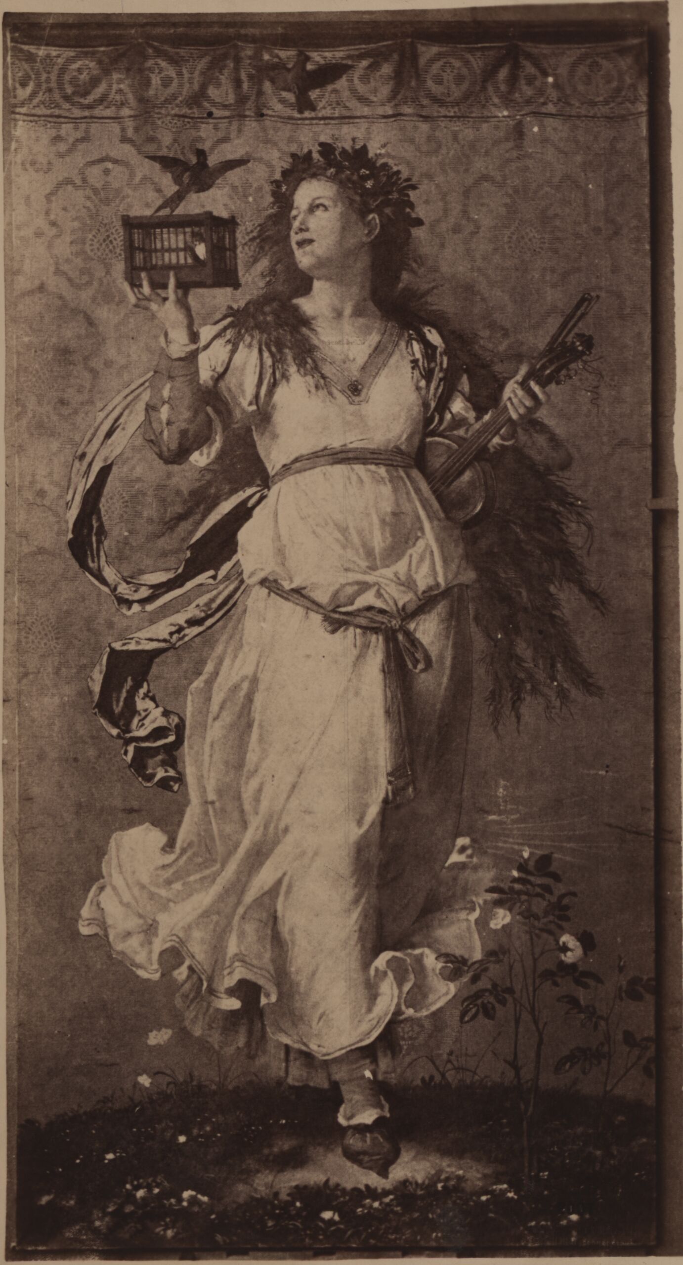 photograph, Fotografie einer Malerei mit einer Figur mit Violine und Vogelkäfig in der Hand, von Friedrich Geselschap, Friedrich Geselschap, MAK Inv.nr. KI 4108-2