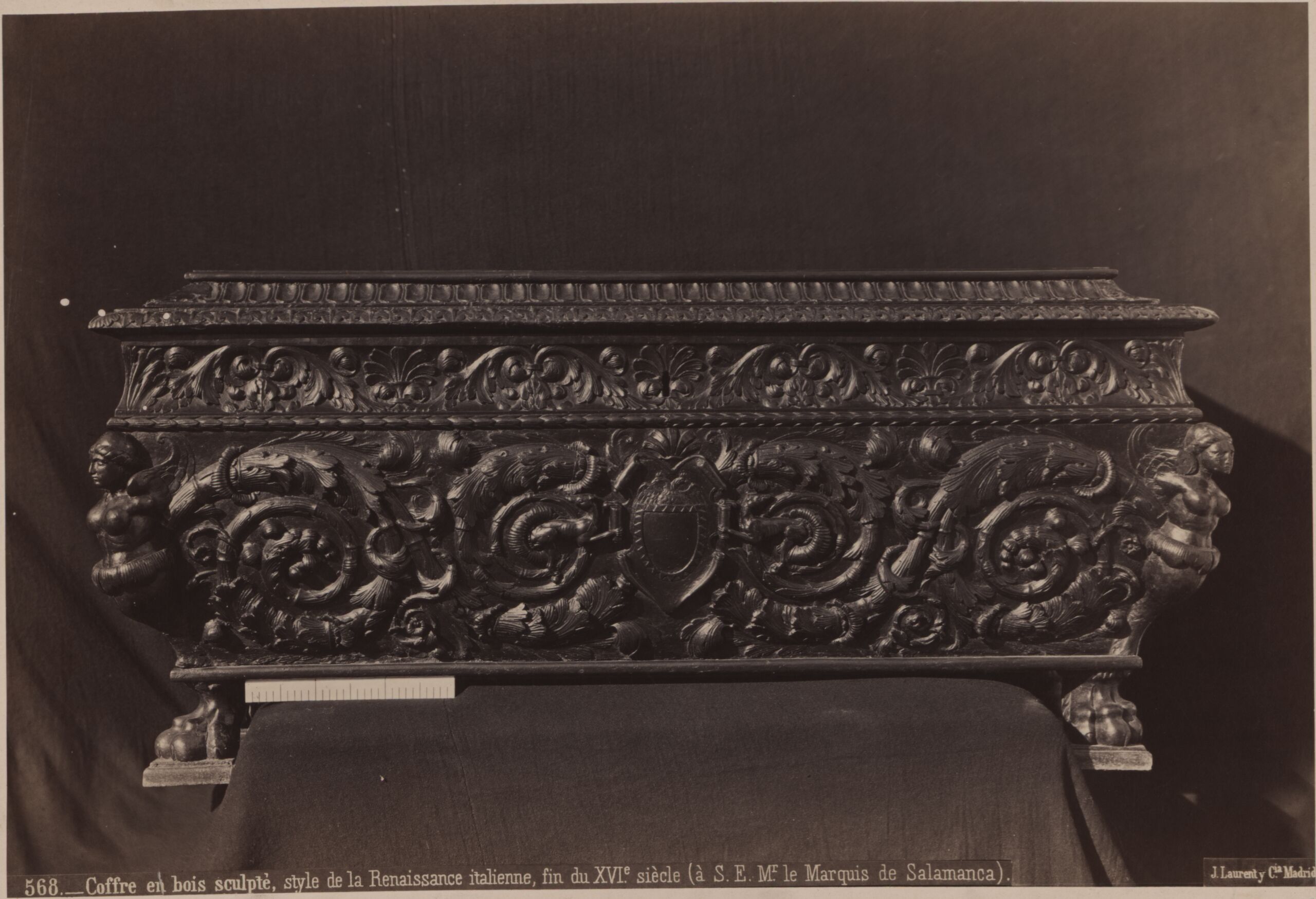 - 作品に記載されている文章: [unten]: 568._Coffre en bois sculptè, style de la Renaissance italienne, fin du XVIe siecle (à S. E. Mr le Marquis de Salamanca). J. Laurent y Cia. Madrid