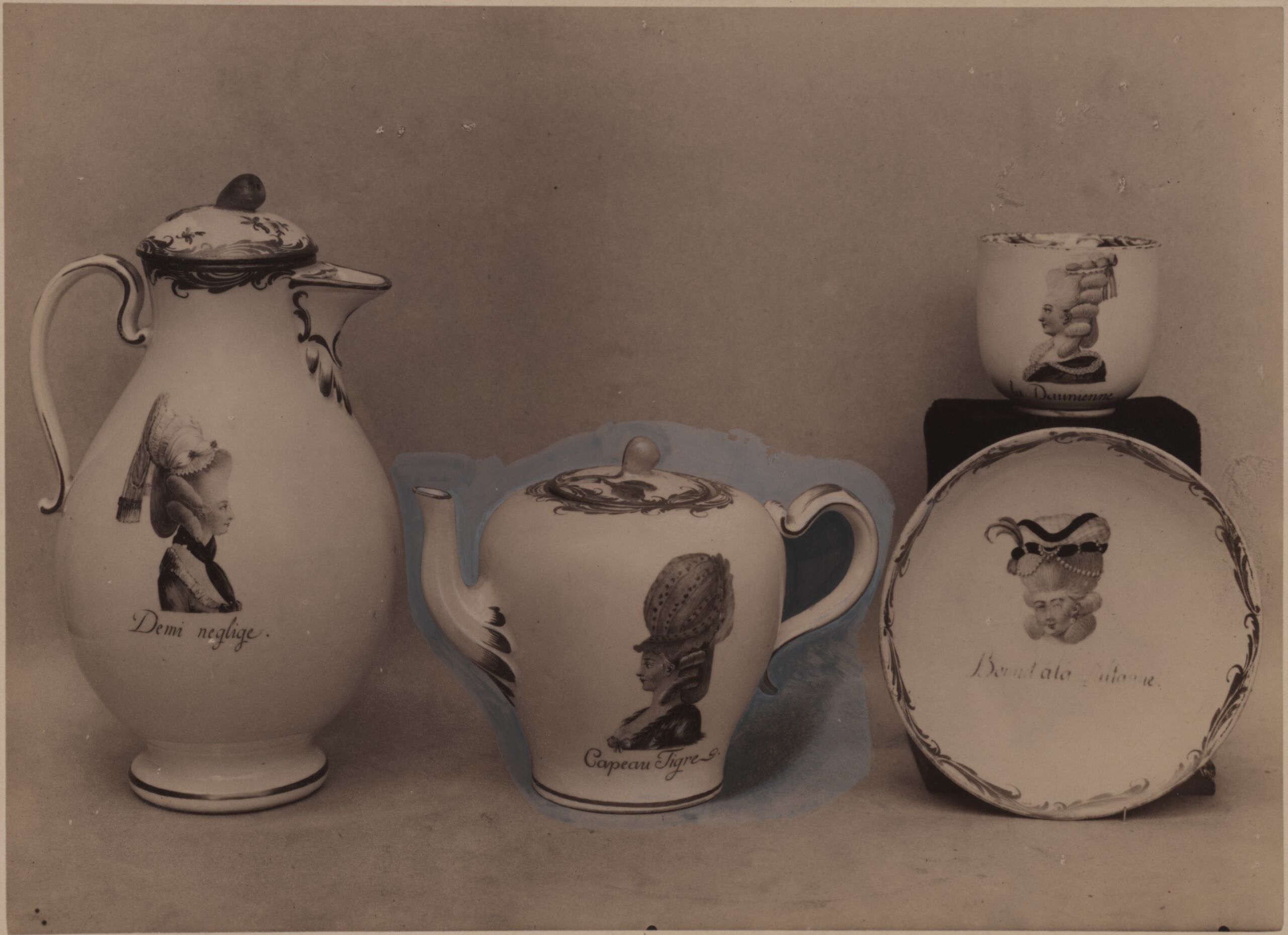 - 作品に記載されている文章: [Untersatzkarton, mittig unten]: 251[Untersatzkarton, links unten]: Wien, Altwiener Porzellan-Ausstellung im K k. Öst. Mus. 1904.[Untersatzkarton, rechts unten]: Frühstückservice mit Pariser Modefrisuren um 1780. / Blaumarke, um 1780. Gottfried Eissler.