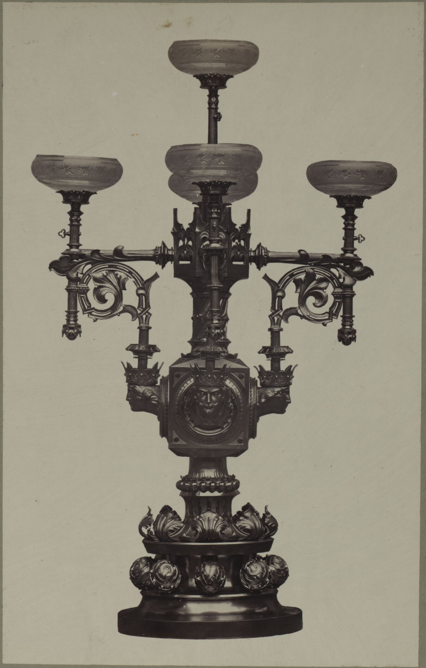 photograph, Fotografie eines Gaskandelabers mit 5 Flammen, vermutlich von Miklós Ybl entworfen, aus dem Jahr 1863, ausgeführt von der Bronzewarenfabrik & Erzgiesserei D. Hollenbach's Neffen Ed. & F. Richter in Wien, Miklós Ybl, MAK Inv.nr. KI 7930-91-2