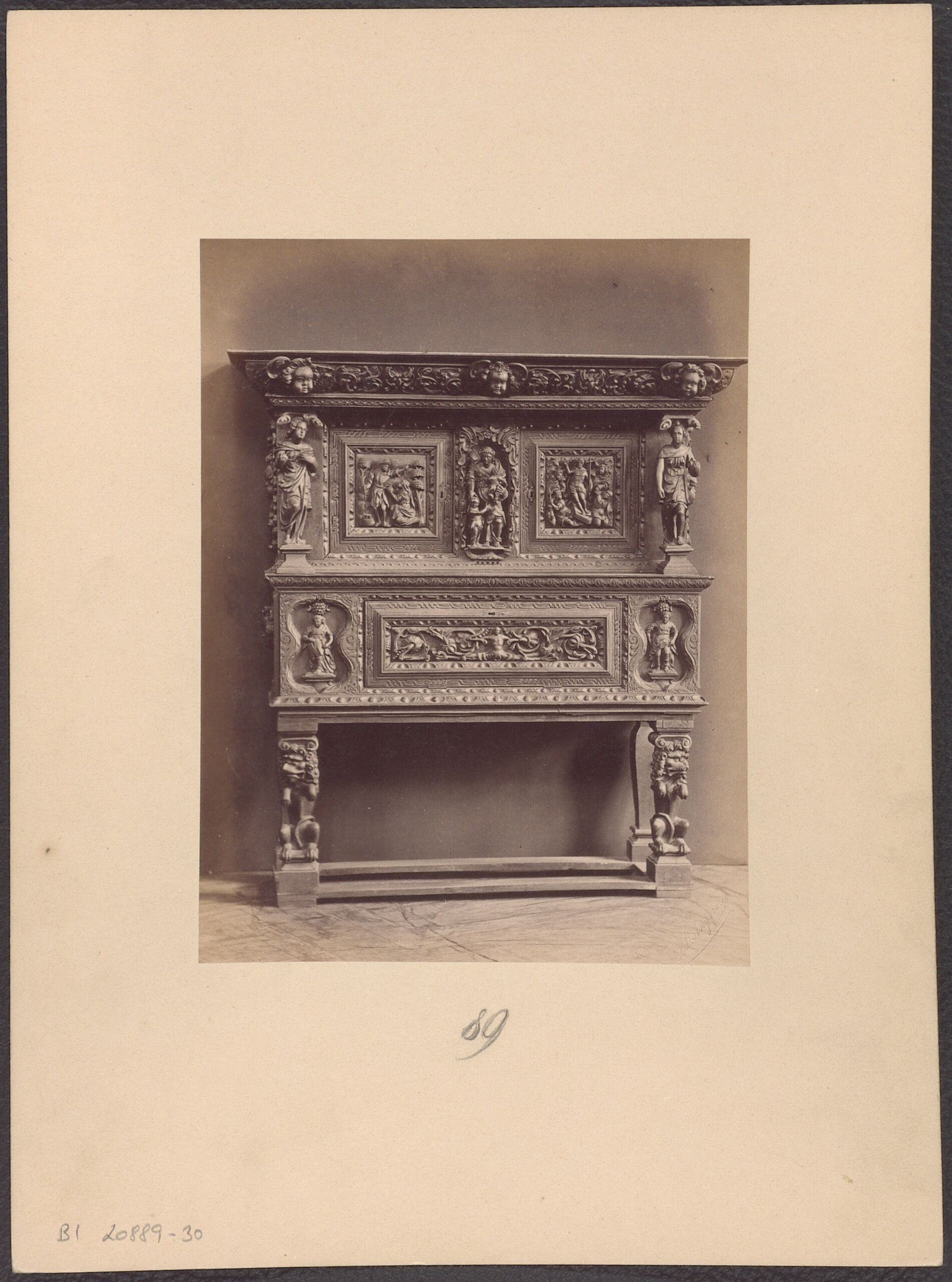 - Fotografie eines geschnitzten Schranks mit Fußgestell und Figuren aus dem 17. Jahrhundert (?) (given title)