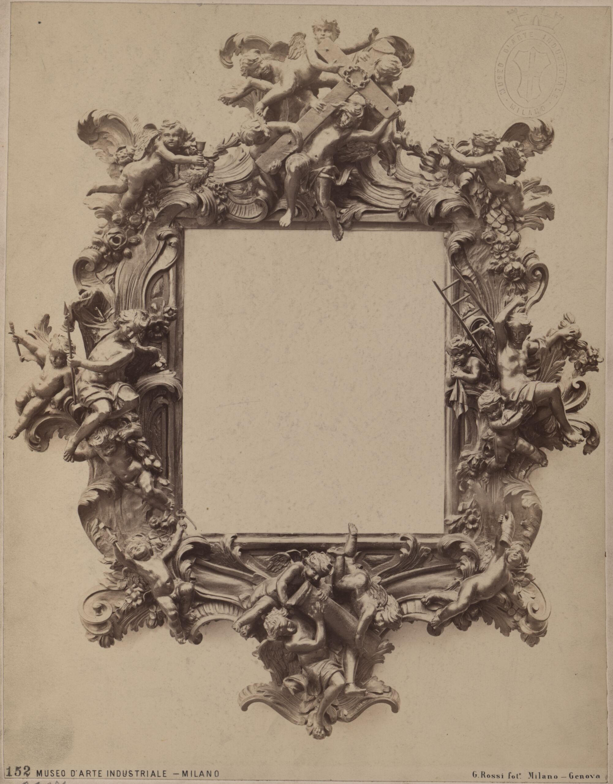 - 作品に記載されている文章: [links]: MUSEO D'ARTE INDUSTRIALE – MILANO [rechts]: G. Rossi fot. Milano - Genova [Untersatzkarton, mittig, geklebt]: Cornice di noce - Scultura del Brestolone. / alt. 0,85 / Poldi Pezzoli Nob. G. G. [Untersatzkarton, rechts]: Rahmen in Nußholz, geschnitzt v. Brostolone / 18. Jhdt.