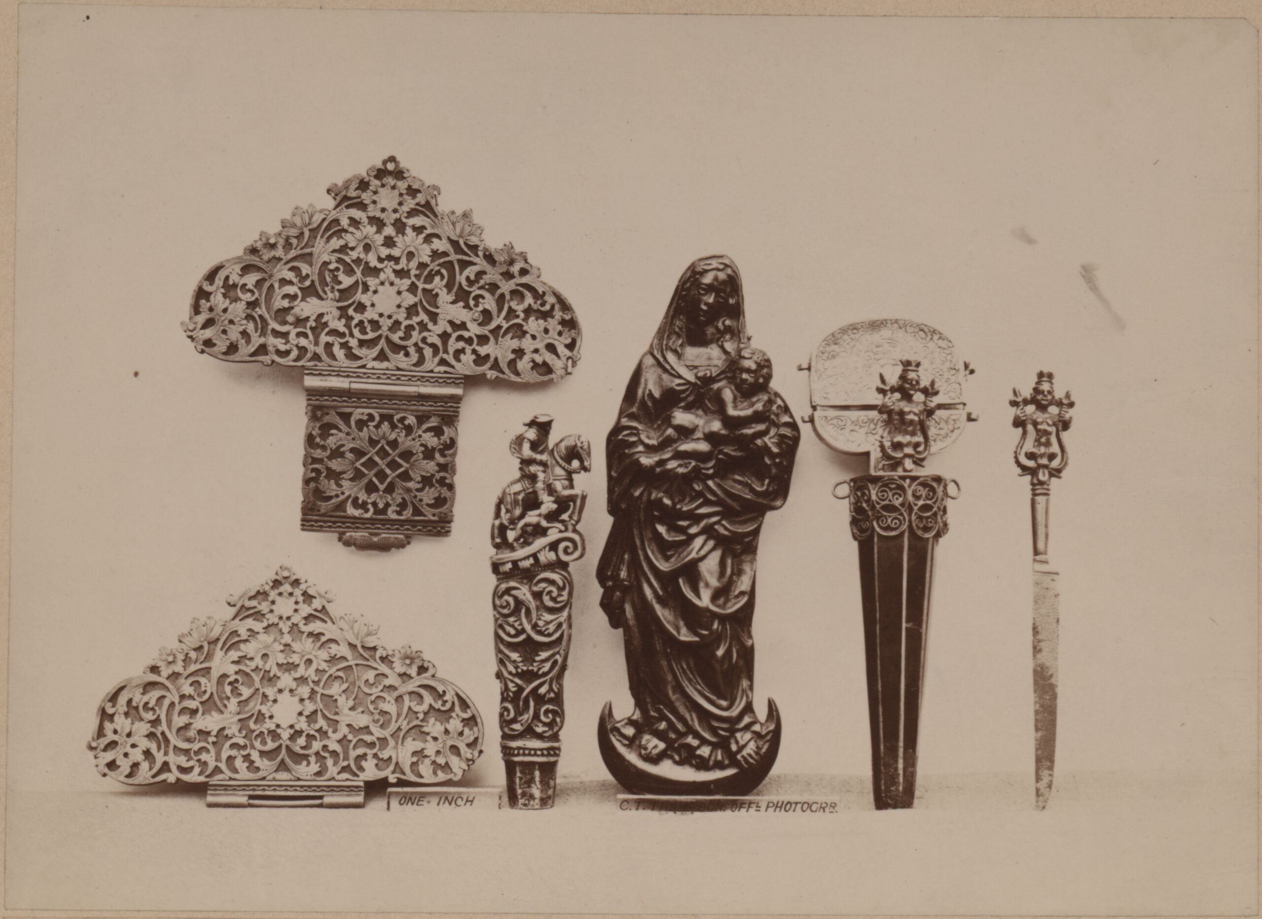 photograph, Fotografie von Silberschließen, Messergriffen und einer Madonna aus einer Ausstellung im ehem. South Kensington Museum, Charles Thurston Thompson, MAK Inv.nr. KI 20250