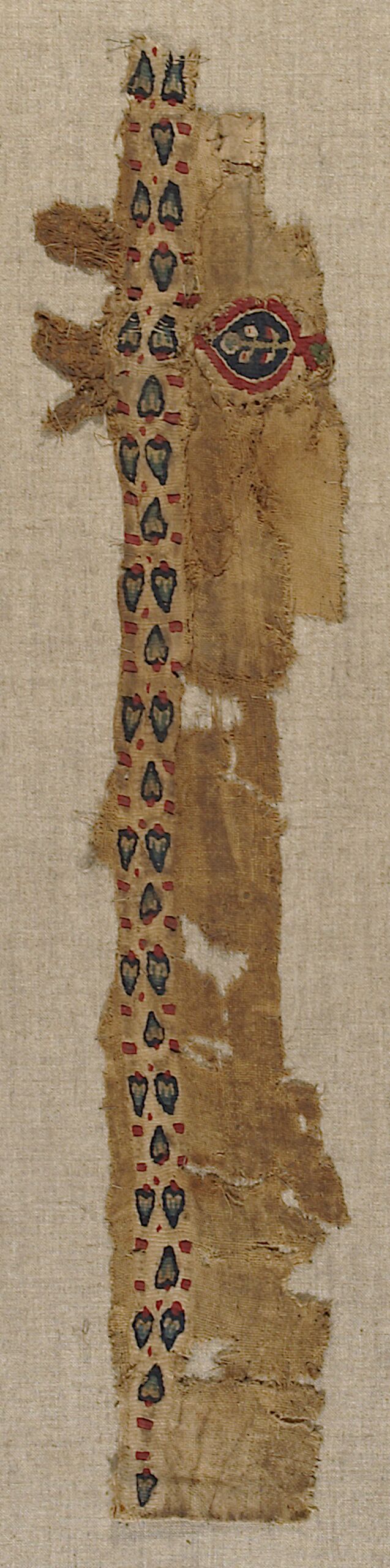 - Fragment of a tunic with remnants of the neck trimming, a foliate decorative element and a decorative band (clavus) of elongated leaves with dots (descriptive title)