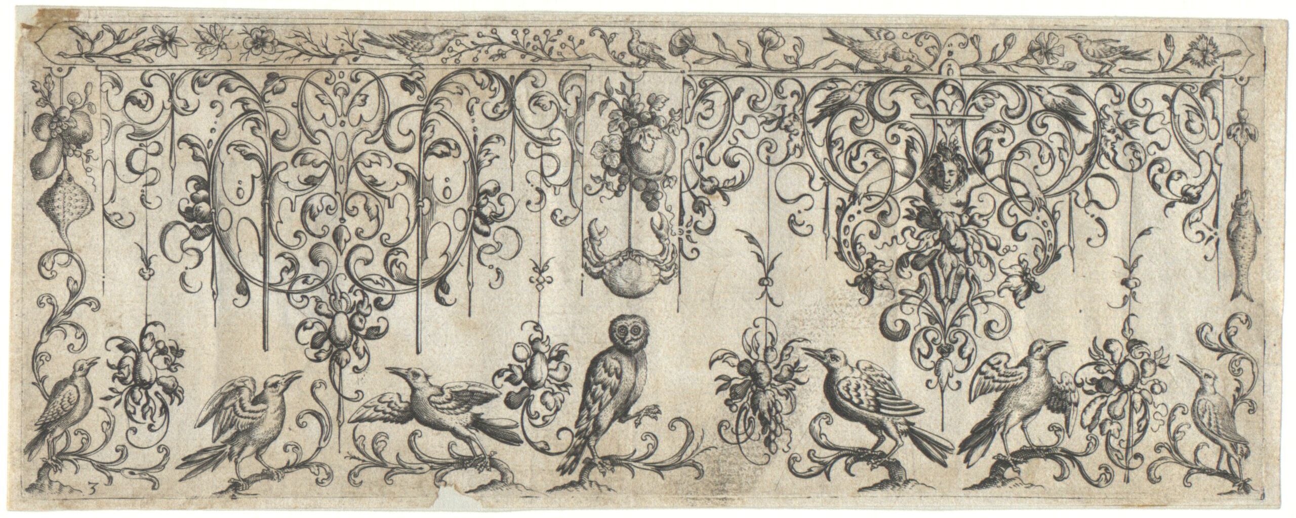ornamental engraving, Fries mit Hängeornamenten mit Früchten und Tieren, Blatt 3 aus einer Folge von freien Kopien nach der Folge „Somige Eenvoldige Vruchten en Spitsen voor D’ ancomen Kunst Liefhebbende Leucht“, nach Michel Le Blon, Michel Le Blon, MAK Inv.nr. KI 1-965-2