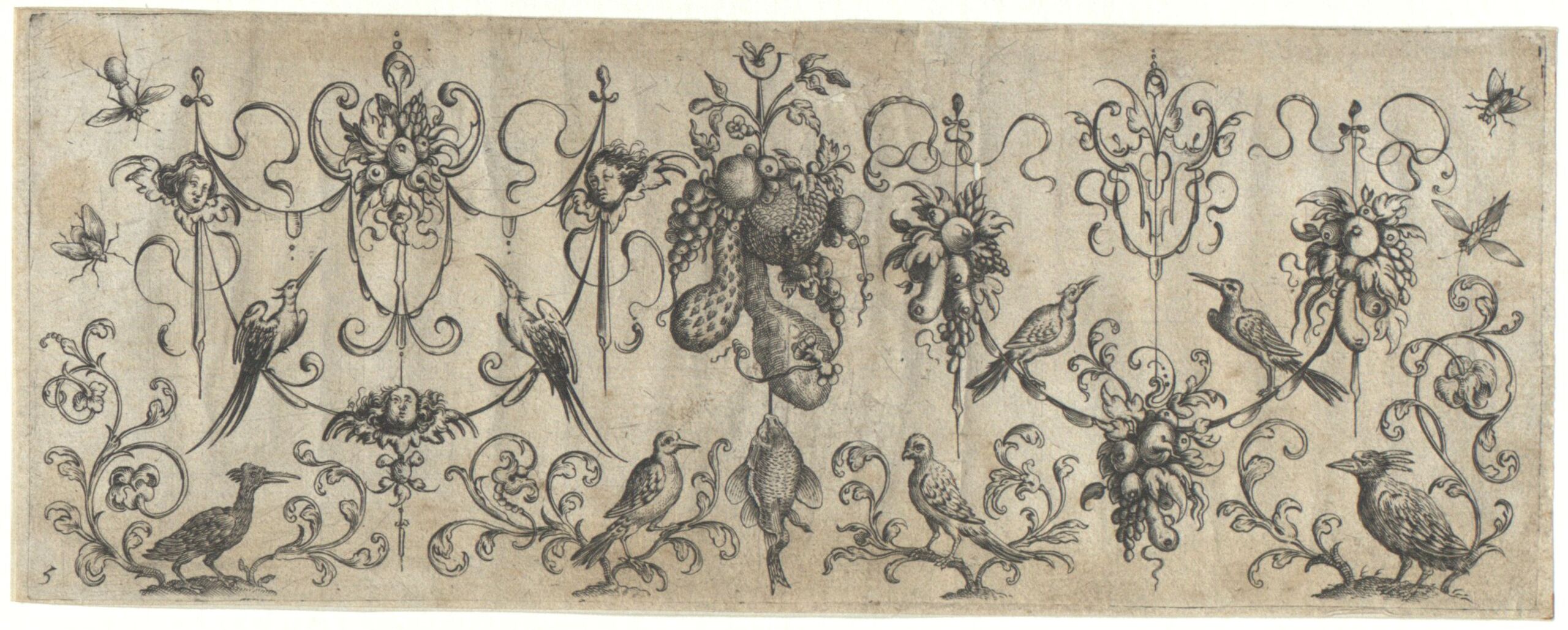ornamental engraving, Fries mit Hängeornamenten mit Früchten und Tieren, Blatt 5 aus einer Folge von freien Kopien nach der Folge „Somige Eenvoldige Vruchten en Spitsen voor D’ ancomen Kunst Liefhebbende Leucht“, nach Michel Le Blon, Michel Le Blon, MAK Inv.nr. KI 1-965-1