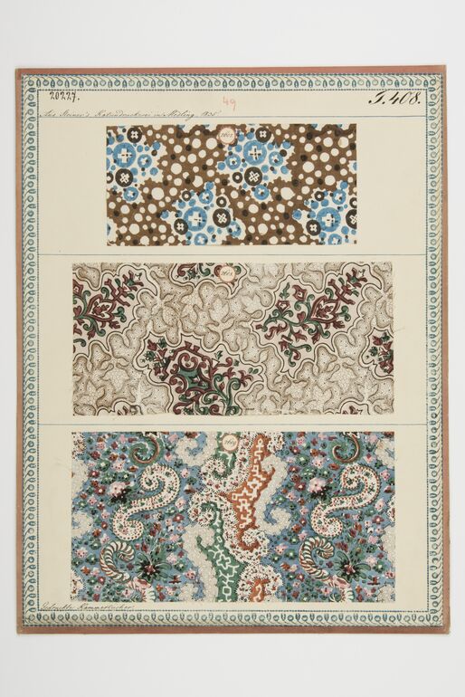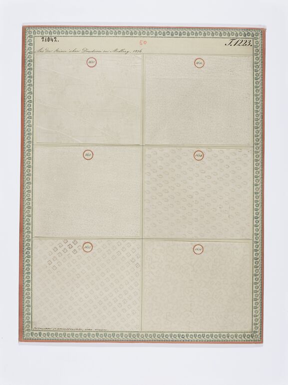- label (front) : Aus Steiner's Kattundruckerei in Mödling, 1833. / Gedruckte Kammertücher. / Gedruckter Croisé