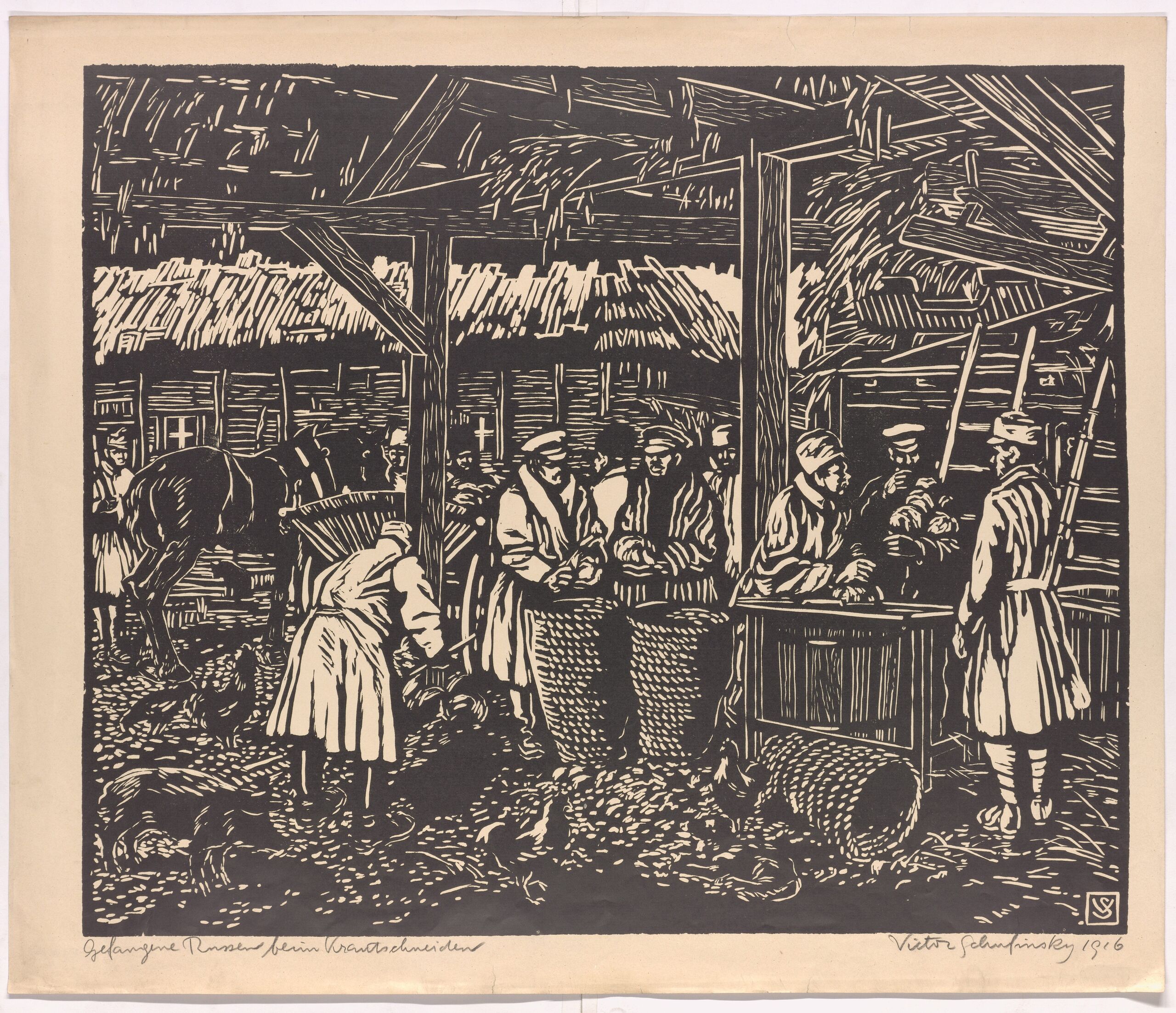 - 作品に記載されている文章: Gefangene Russen beim Krautschneiden [links unten] Viktor Schufinsky 1916 [rechts unten]