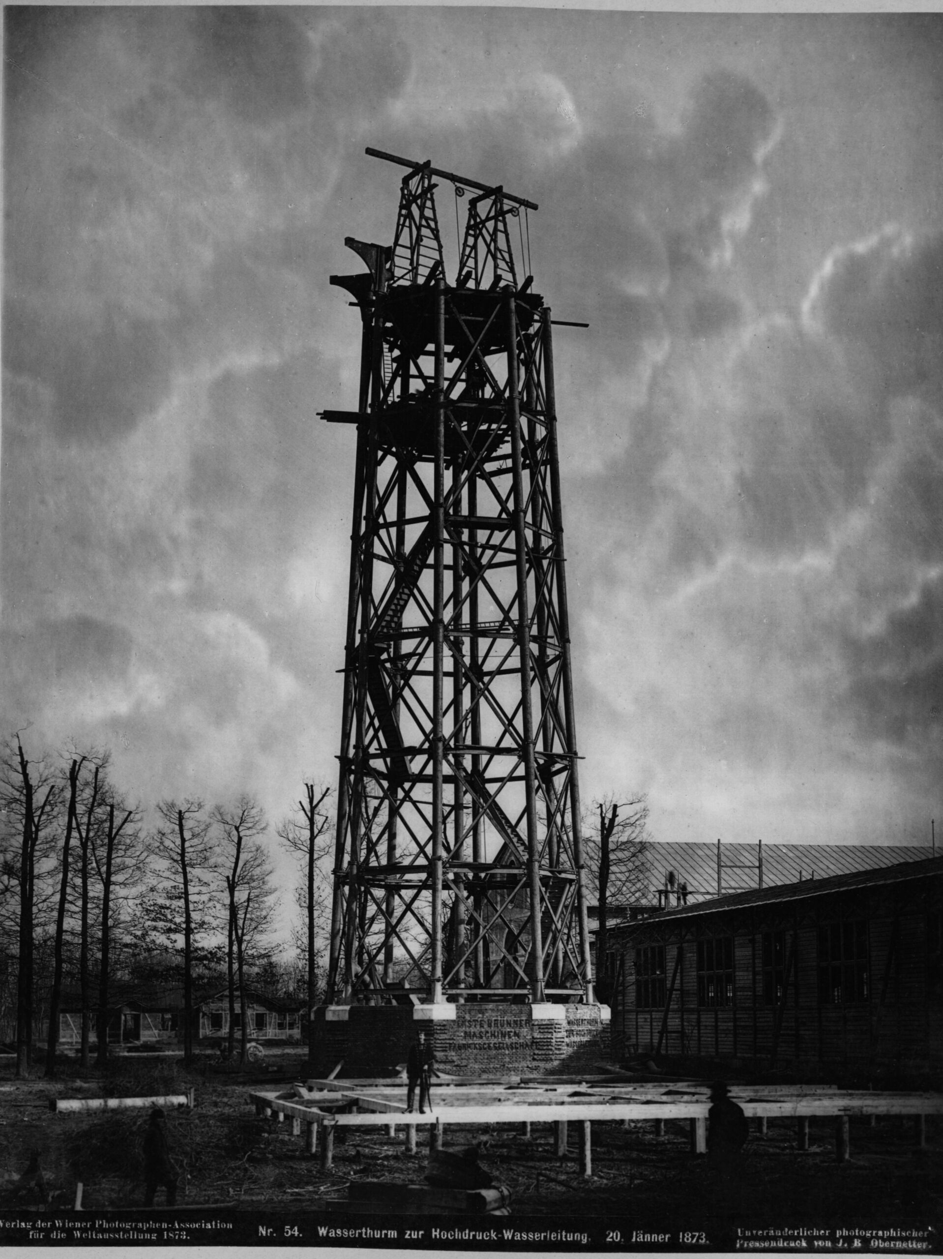 - 作品に記載されている文章: Weltausstellung in Wien 1873 / Bauten auf dem Ausstellungsplatze / Photographie und Verlag der concessionirten / Wiener Photographischen Association. am Foto: Wasserthurm zur Hochdruck-Wasserleitung