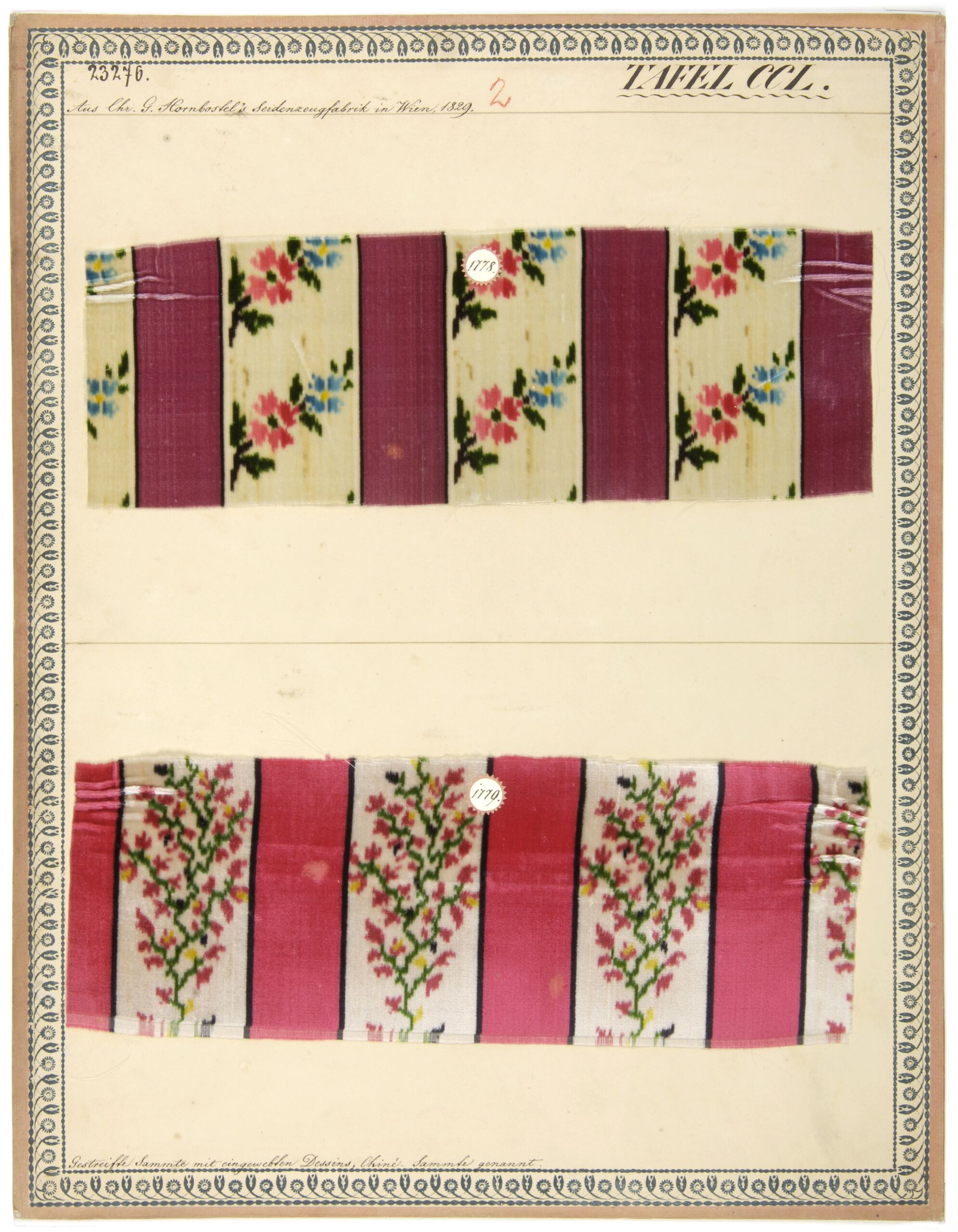 - label (front) : Aus Chr. G. Hornbostel's Seidenzeugfabrik in Wien, 1829 / Gestreifte Sammte mit eingewebten Dessins, Chiné-Sammte genannt.