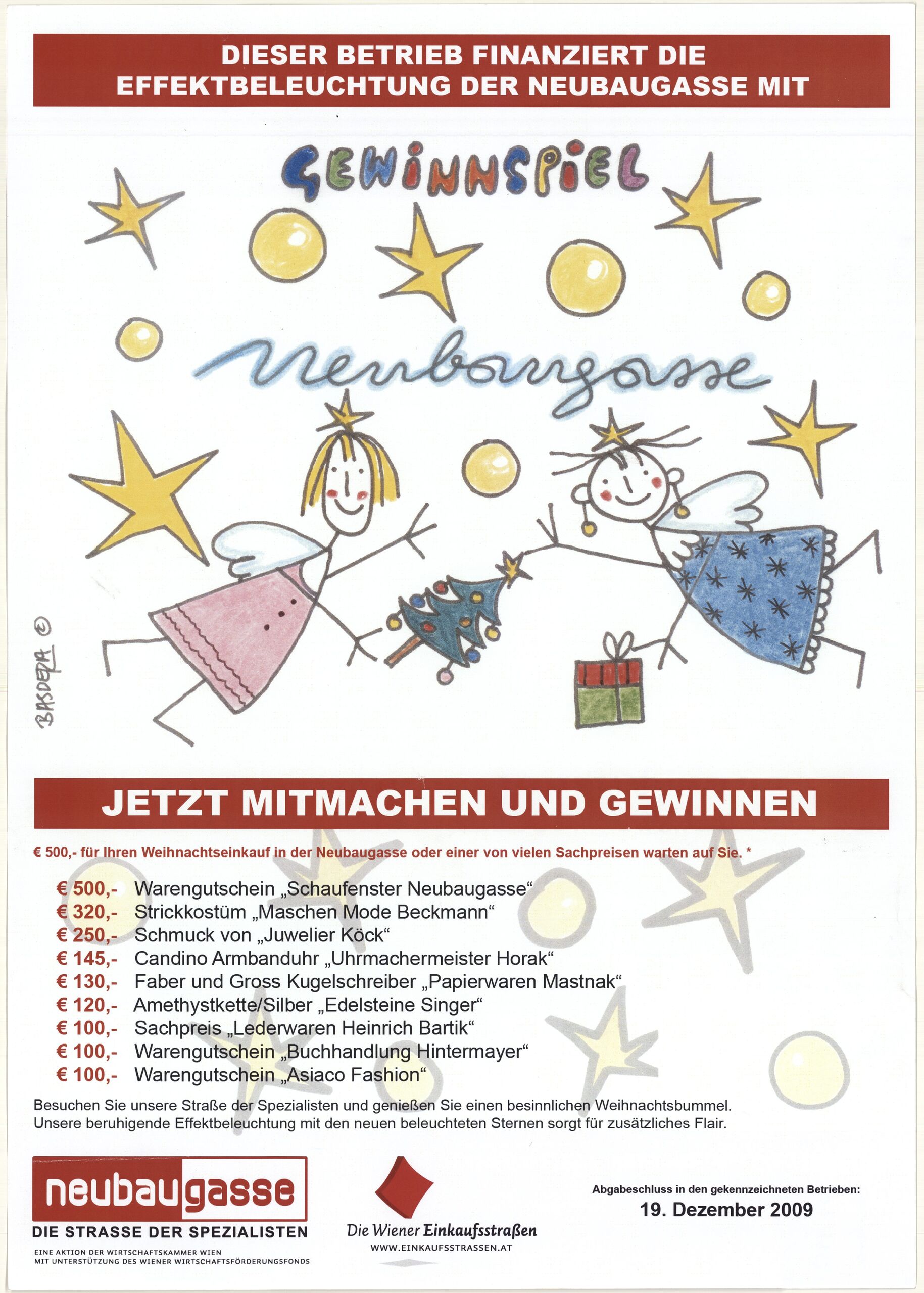 - 作品に記載されている文章: Dieser Betrieb Finanziert die Effektbeleuchtung der Neubaugasse mit. Gewinnspiel Neubaugasse. Jetzt mitmachen und gewinnen 500 Euro für ihren Weinachtseinkauf in der Neubaugasse oder einer von vielen Sachpreisen warten auf sie. 500euro Warengutschein „Schaufenster Neubaugasse“, 320 Euro Strickkostüm „Maschen Mode Beckmann“ 250 Euro Schmuck von „Juwelier Köck“.....