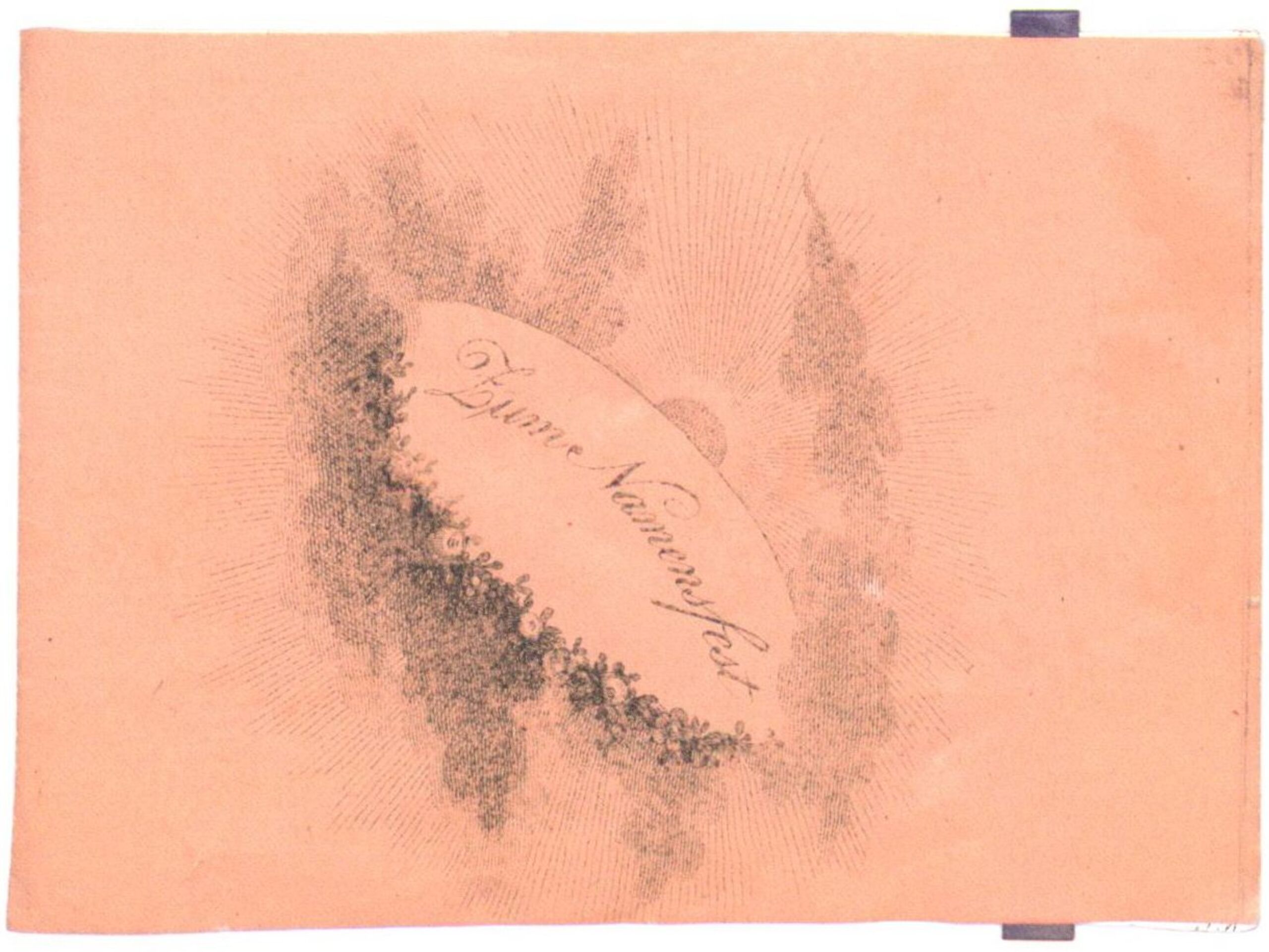- 作品に記載されている文章: Zum Namensfest; Josef [alles gedruckter Text] [...] [3. Seite, Feder in Braun]; Zufriedenheit und Wohlseyn lang! / Ist mein Wunsch und Herzensdrang. [gedruckter Text]