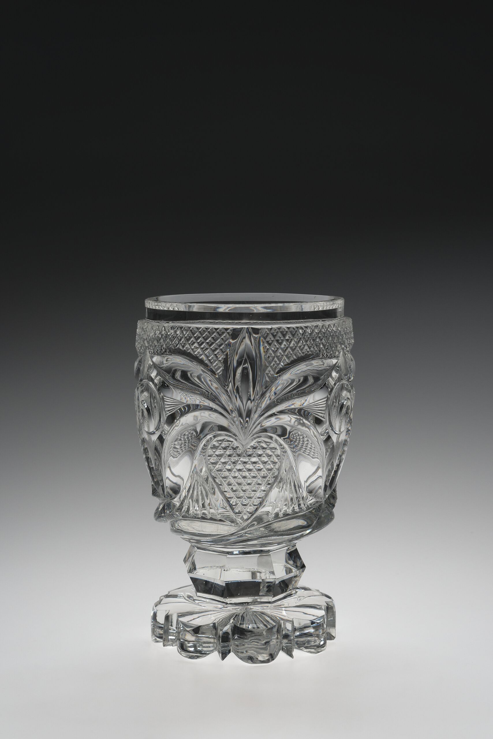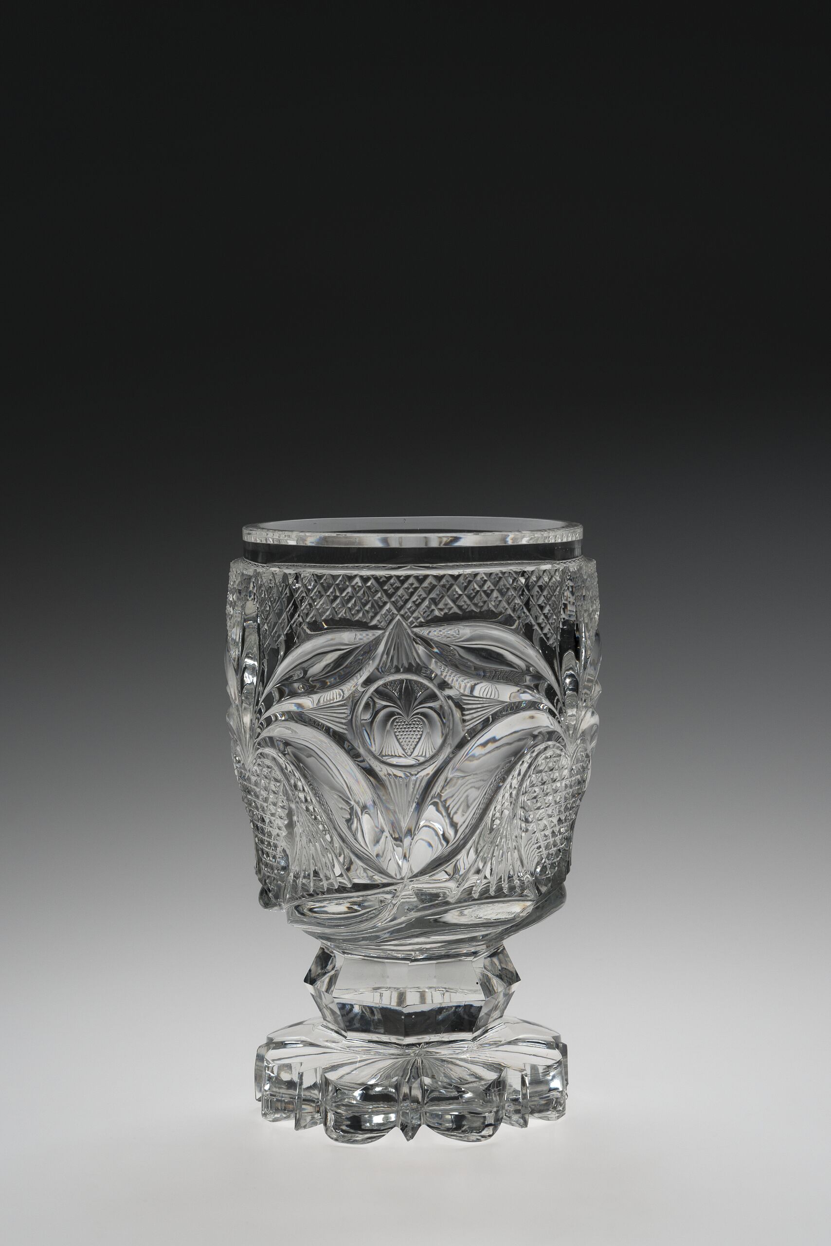 auf achtteiliger Fussplatte alternierend aus gewalzten und kantigen Strahlen sitzt facettierter Nodus. Auf der Kuppa drei herzförmige Vasen gesteindelt aus denen Blattwerk im Walzenschliff wächst, dazwischen Verkleinerungslinsen, darüber Steindelfries. Abgestzter Mundrand; am unteren Kupparand Walzenschliff