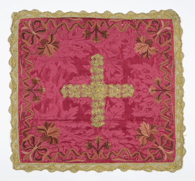 chalice veil, Goldranke mit bunten Blumen auf weißem Grund, in der Mitte Kreuz, Anonym, MAK Inv.nr. T 4764-4
