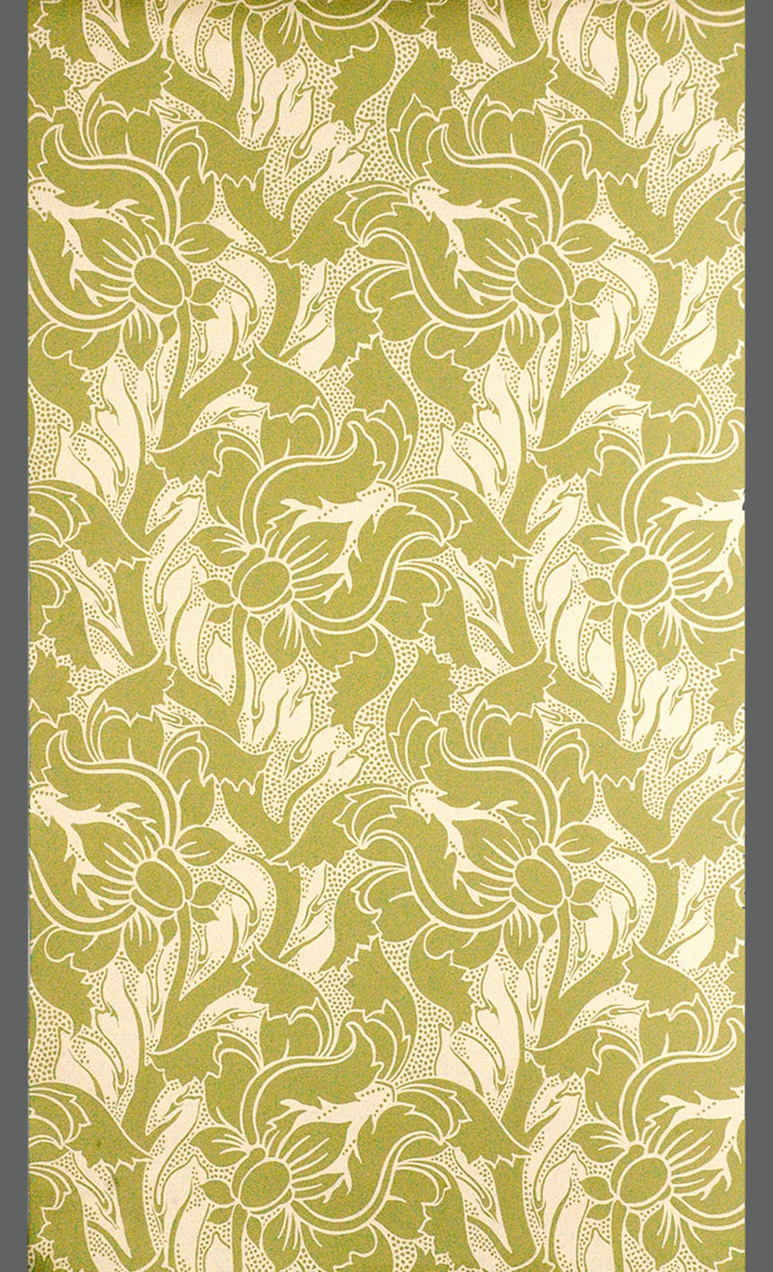 wallpaper sample, Green tendrils with large surrealistic flowers and pale leaves, dotted background, Alexander & Co. Rottmann, MAK Inv.nr. T 13527-21