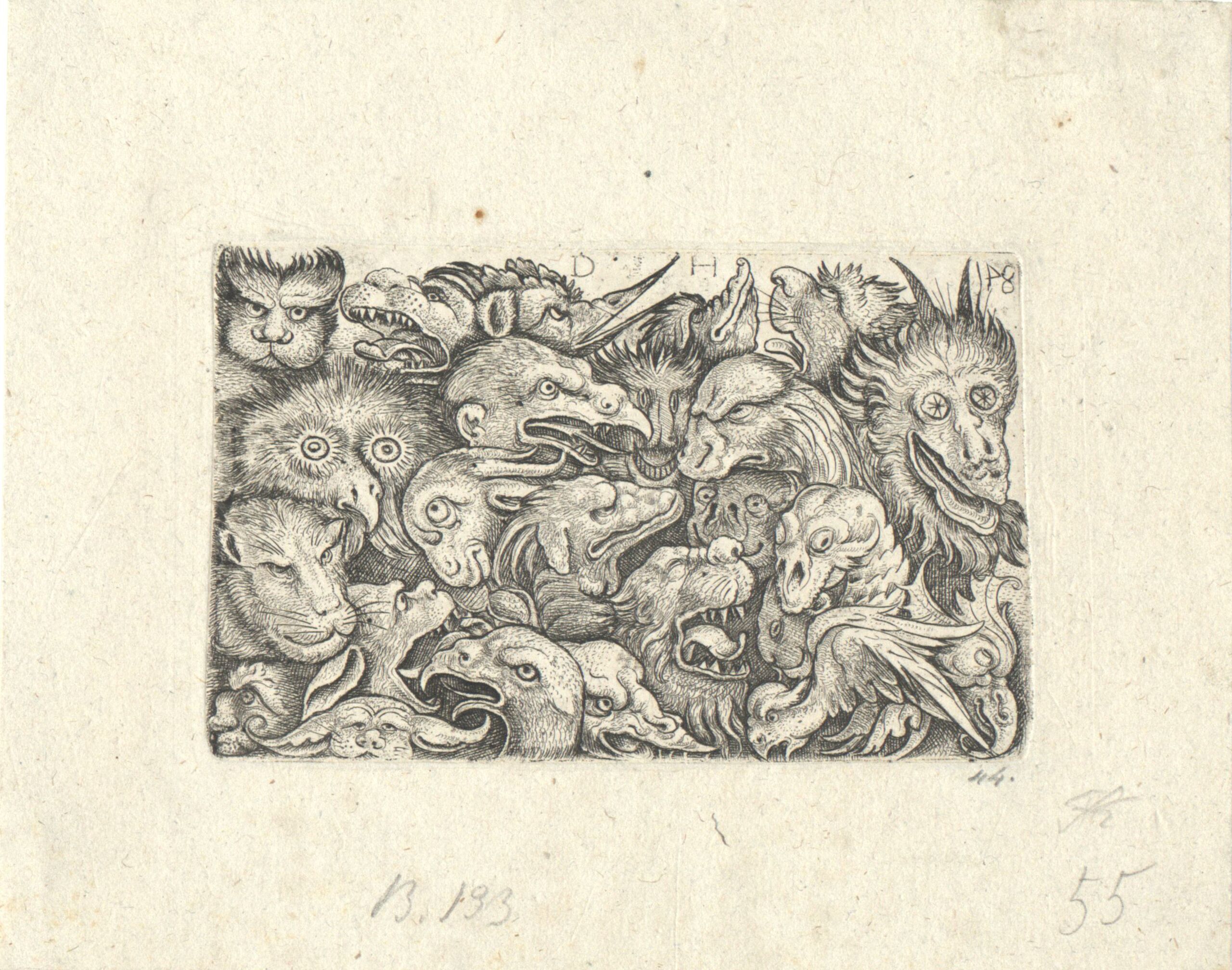 Druckgrafik, Groteske Tierköpfe, mit Funck- Nummer 148, Daniel Hopfer, MAK Inv.nr. KI 1-146