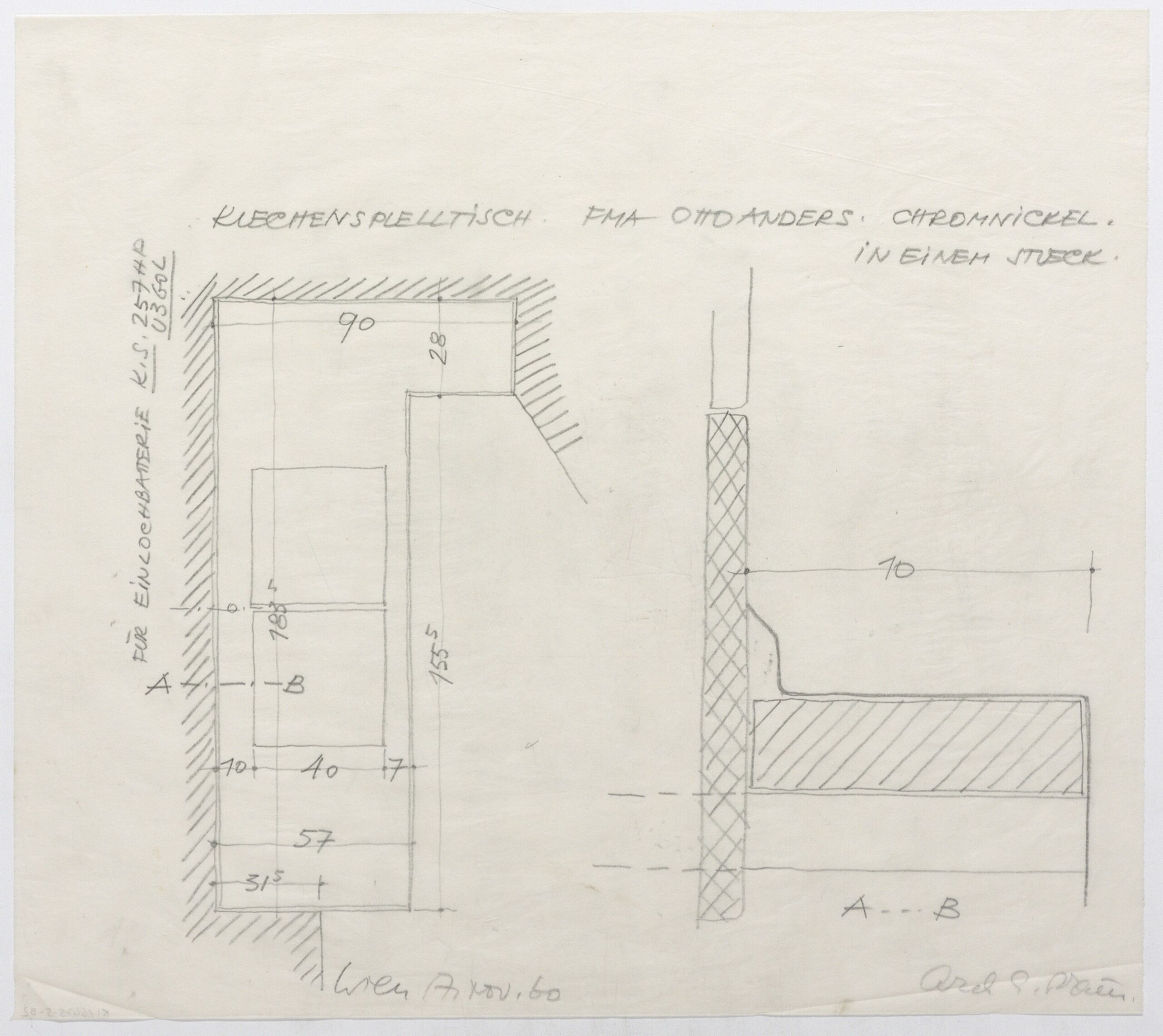 デザイン, Grundriss und Detailansicht von einem Küchenspültisch, Anna-Lülja Praun, MAK Inv.nr. KI 16475-5-52