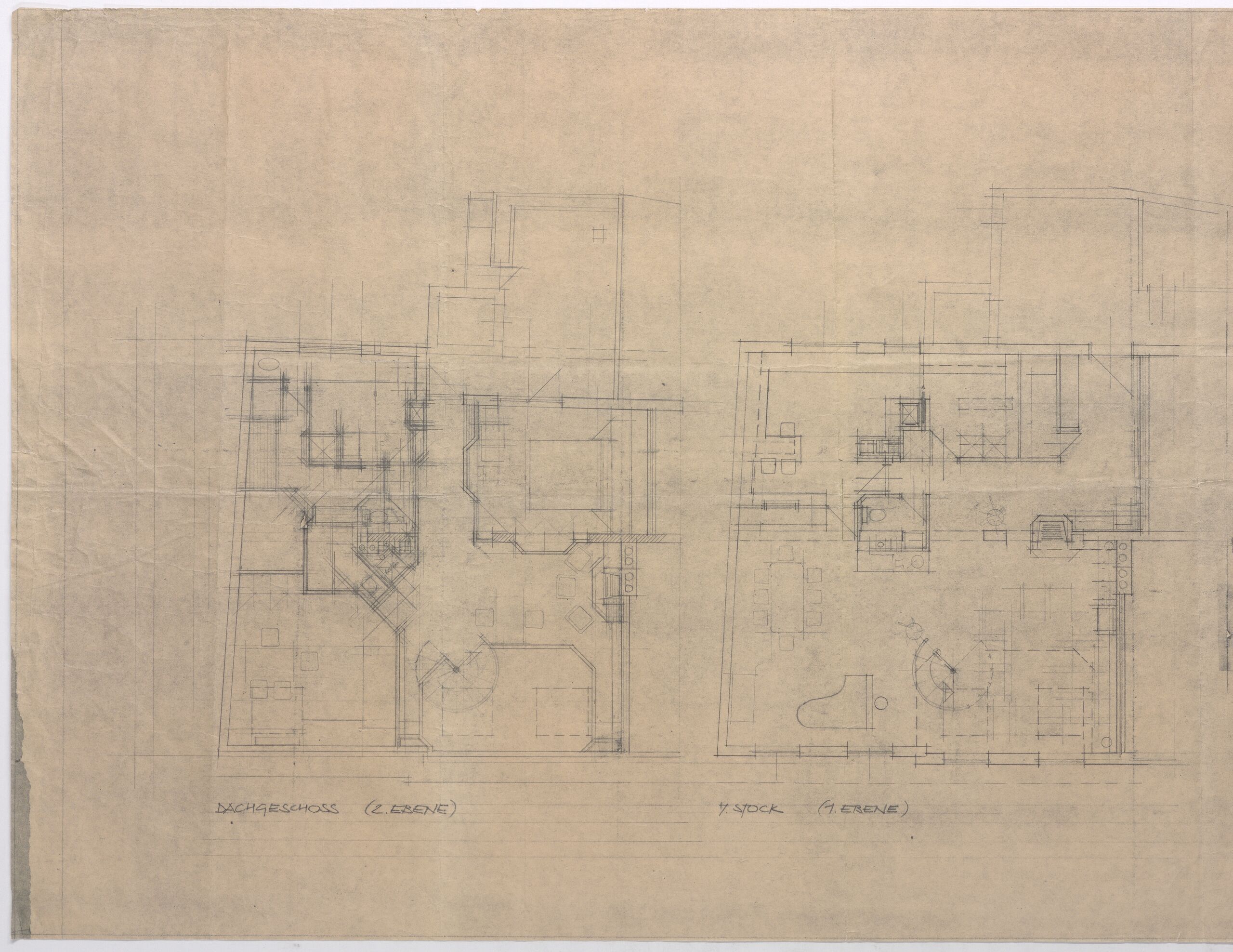 - Grundrisse der zwei Ebenen der Wohnung, Querschnitt der Ebenen (given title)