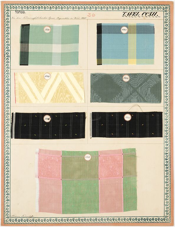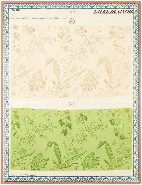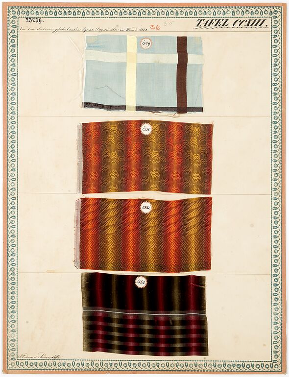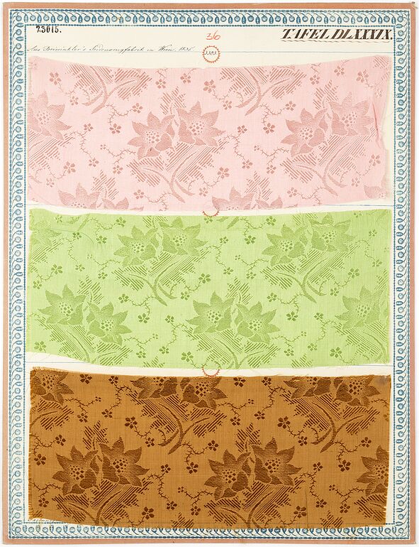 - label (front) : Von dem Seidenzeugfabrikanten Ignaz Beywinkler in Wien, 1838. / Halbwollene Möbel-Damaste aus Schaf- und Baumwolle. / Bleistiftnotiz: 21. Juni 1838