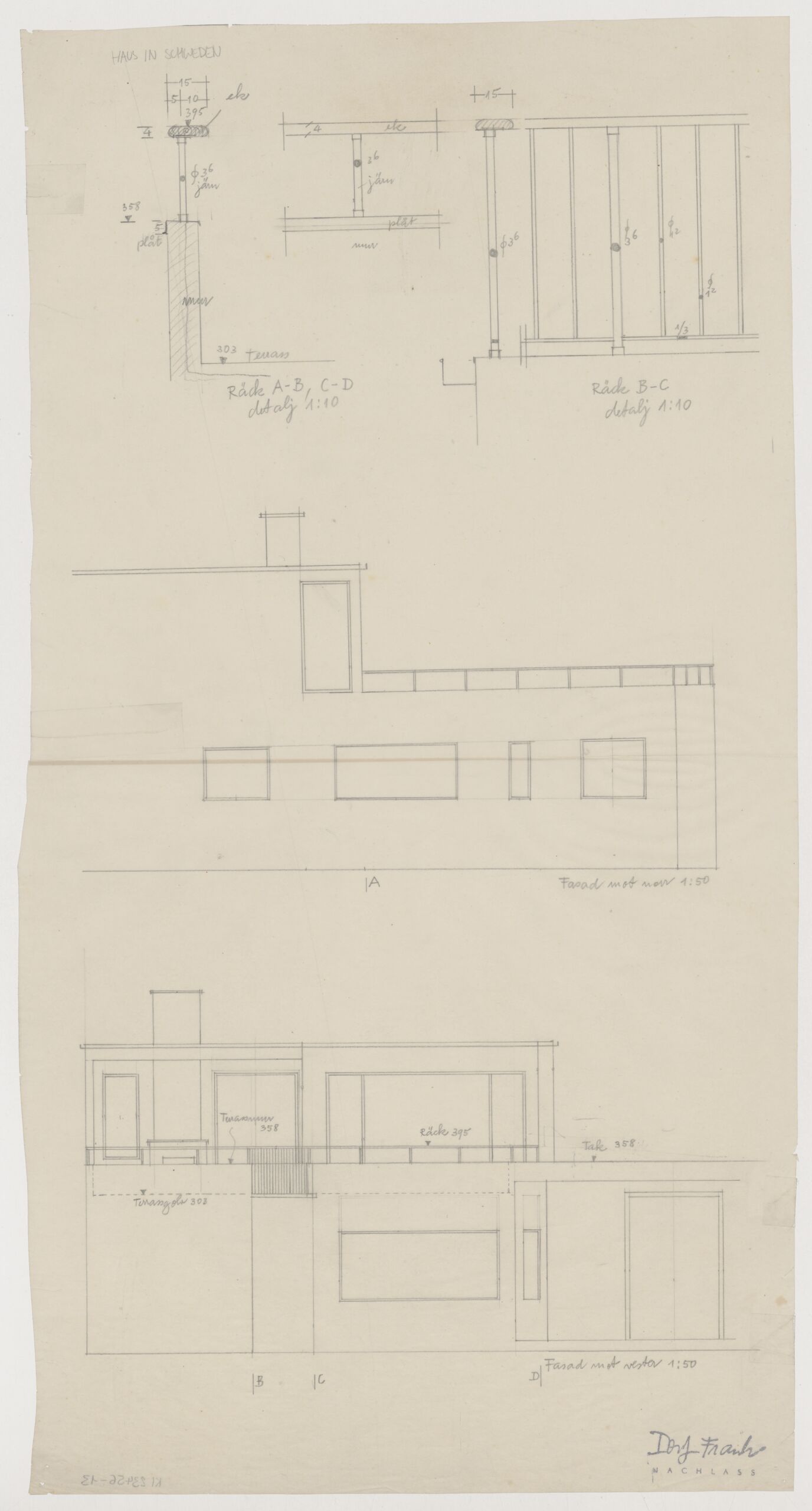 • Text am Objekt (Vorderseite, links oben) : 15 / 5 10 / 395 / ek / 4 / Ø 36 / jäm / 358 / plåt / mur / 303 Terrass / Räck / detaj / A-B, C-D / 1:10