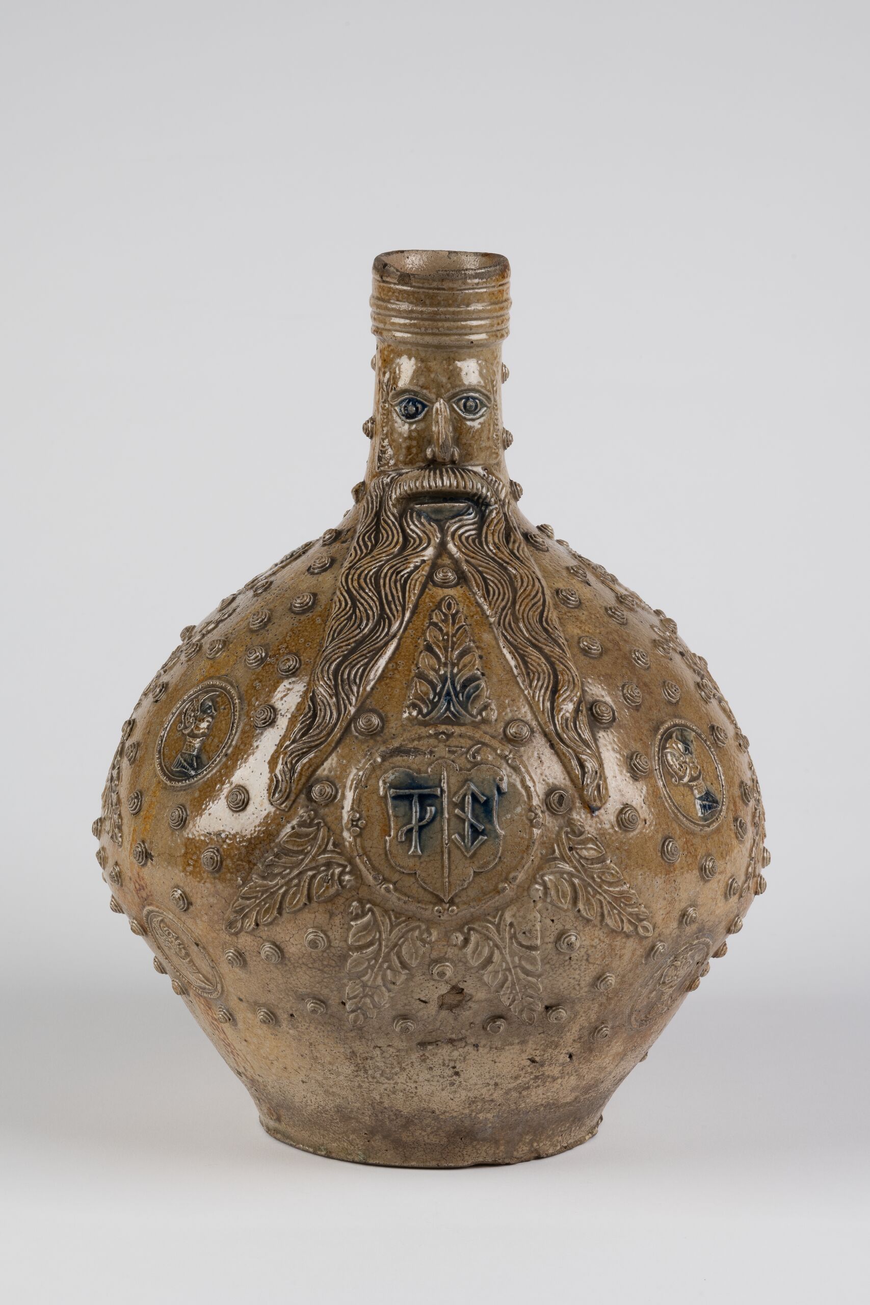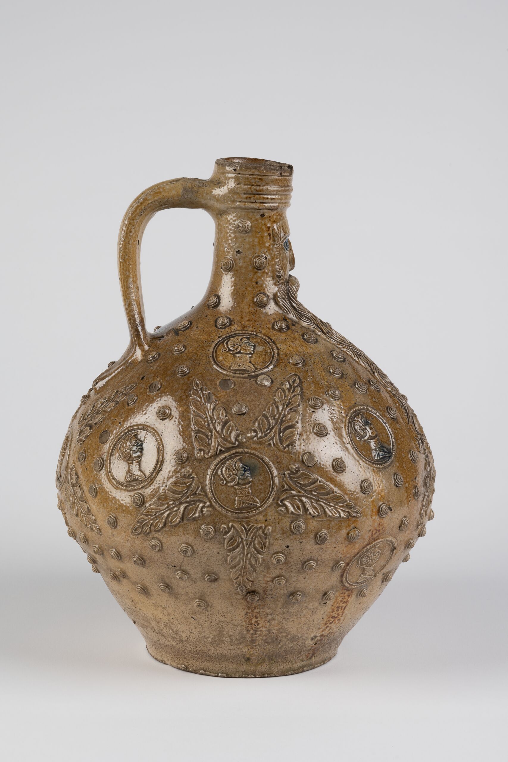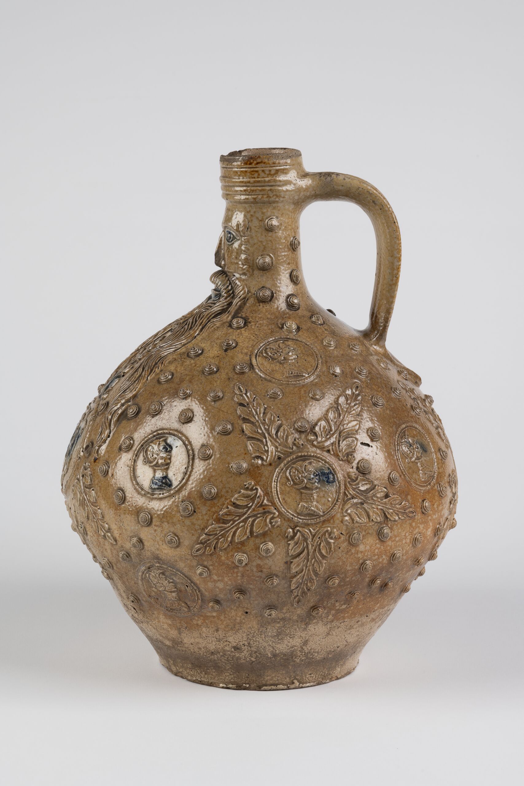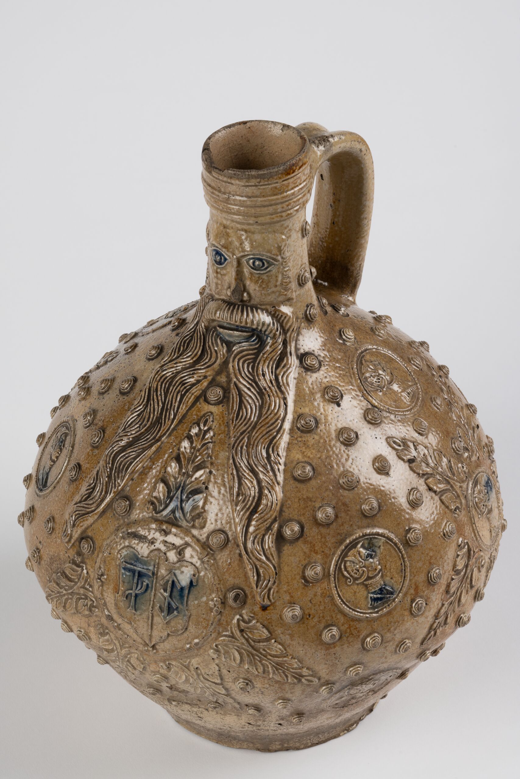 bauchiger Bartmannskrug. Wappen mit Hausmarke, dat. 1576. Kleine Medaillons. Blattspitzen und Schnecken