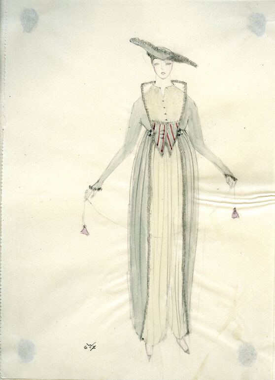 - 作品に記載されている文章: „Franziska" / Jacke aus Tafft / oder Sammt / Volant aus / Foulard / Rock aus Tafft / in gesteppten / Plissées