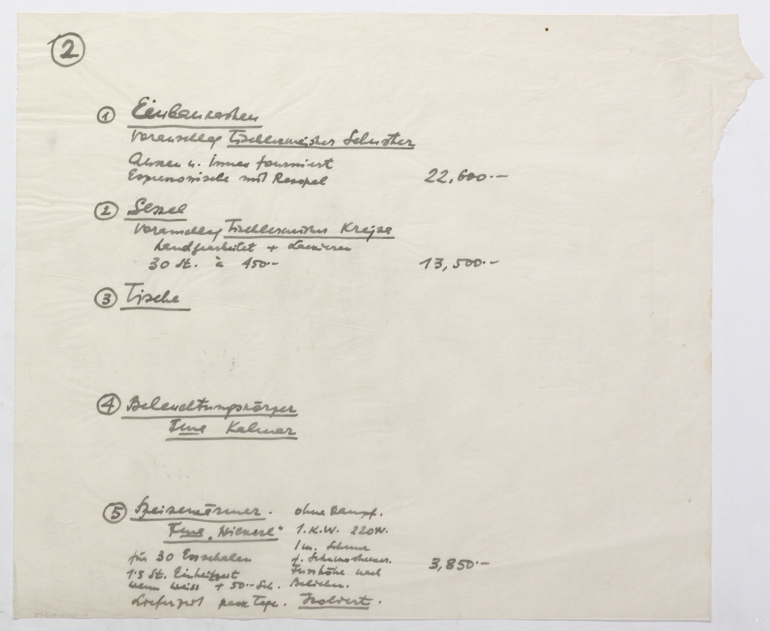 - 作品に記載されている文章: 2 / 1 Einbaukasten / Voranschlag Tischlermeister Schuster / Außen u. innen fourniert / Espressonische mit [?] 22,600.- / 2 Sessel / Voranschlag Tischlermeister Krei[?] / handgearbeitet + Laminieren / 30 St. à 450.- 13,500.- / 3 Tische / 4 Beleuchtungskörper / Fma Kalmar / 5 Speisenwärmer. ohne Dampf. / Fma "Niekere" 1 K.W. 220W. / für 30 Essschalen / 1.5 St. Einheizzeit / wenn weiss + 50.-Sch. / Lieferzeit paar Tage /1m. Schnur / f. Sch[?] / Fusshöhe nach / Belieben / Isoliert / 3,850.-