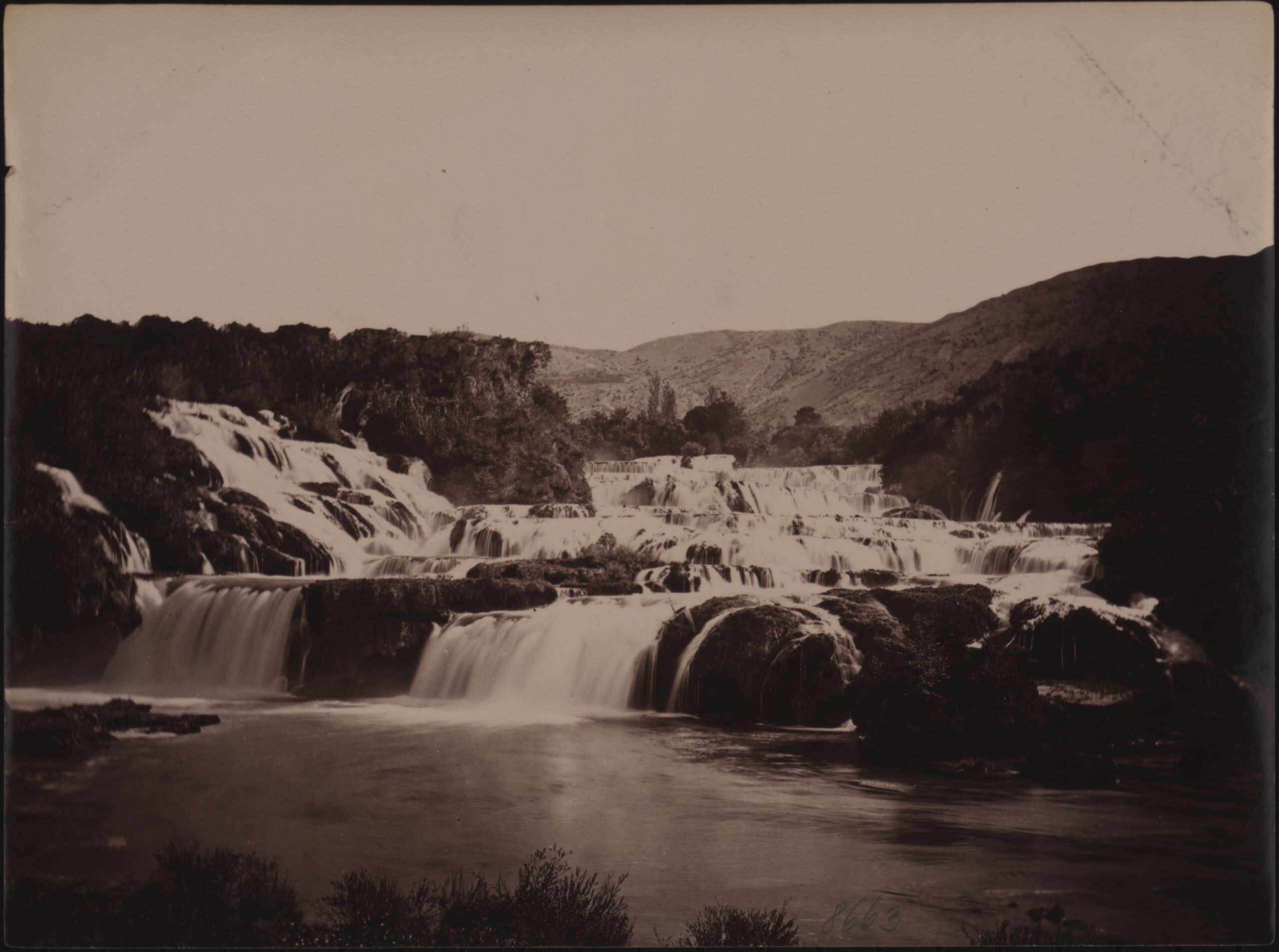 photograph, Landschaftsansicht mit Krka Wasserfällen bei Skradin (Scardona) in Kroatien, eventuell im Naturreservoir Slapovi Krke, Anonym, MAK Inv.nr. KI 8663-29