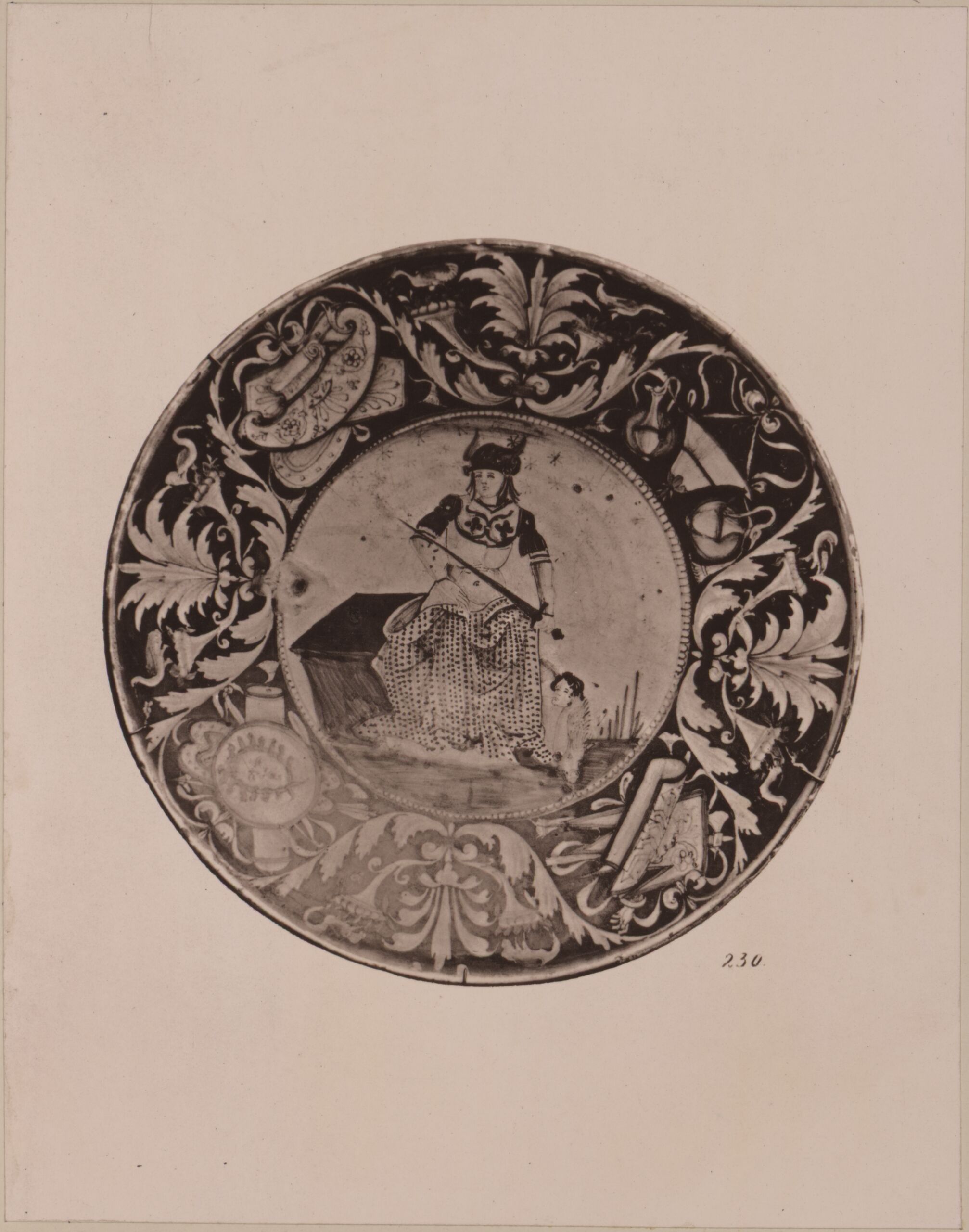 - 作品に記載されている文章 (Untersatzkarton, mittig unten) : 230. Majolikateller. In der Mitte ein sitzender Ritter, der / Rand Arabesken. 0,40 Durchm. Caffagiolo Anfang / XVI. Jahrh. Deutsches Gewerbe-Museum.