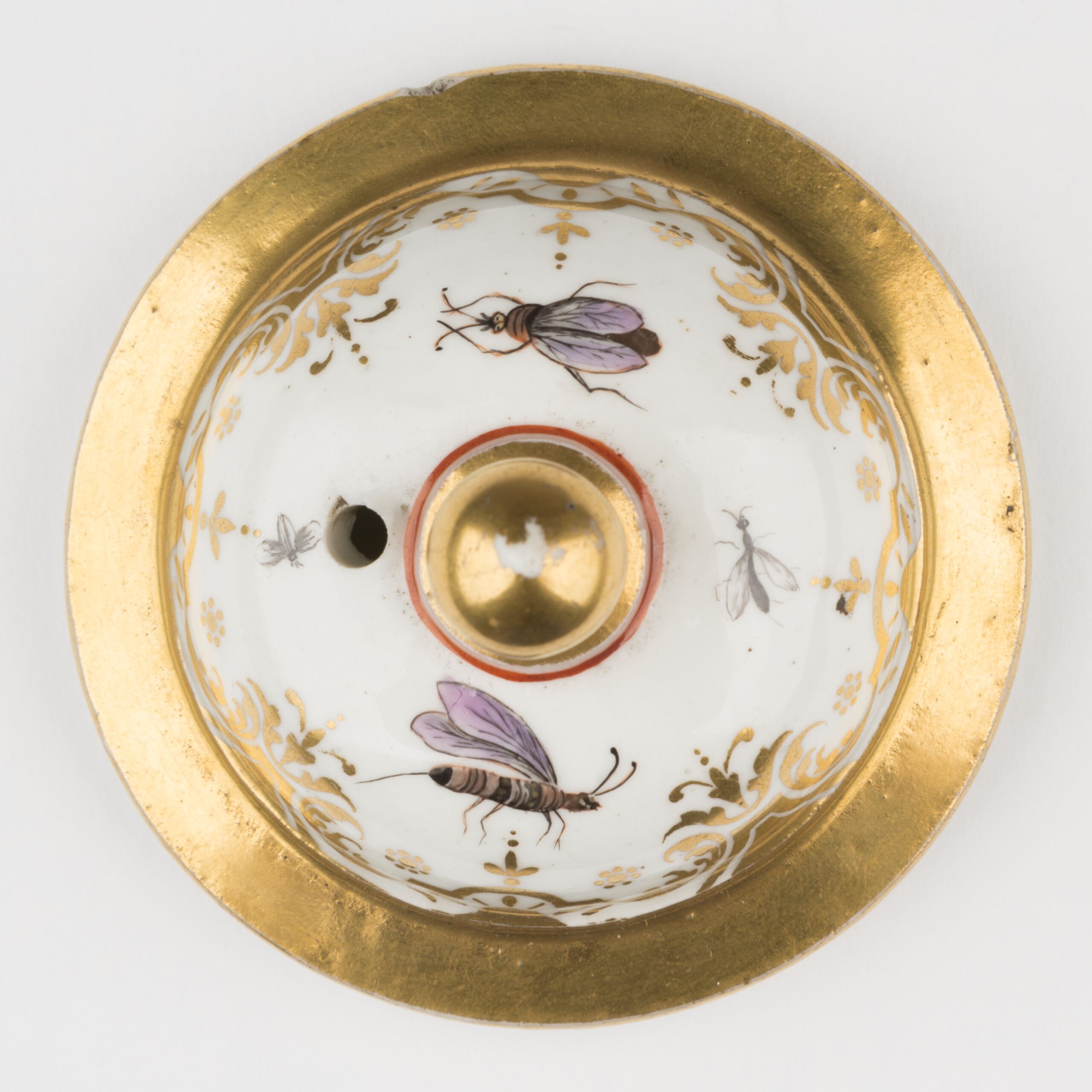 Kanne; bauchige hohe Form mit Schnabel, geschwungenem Henkel (abgebrochen) und Deckel mit goldenem Knauf und zwei farbigen Insekten, auf der Wandung der Kanne zwei große Kartuschen mit farbigen Hafenszenen; violett umrahmt mit herauswachsenden Palmetten in Gold, Purpur und Gelbrot