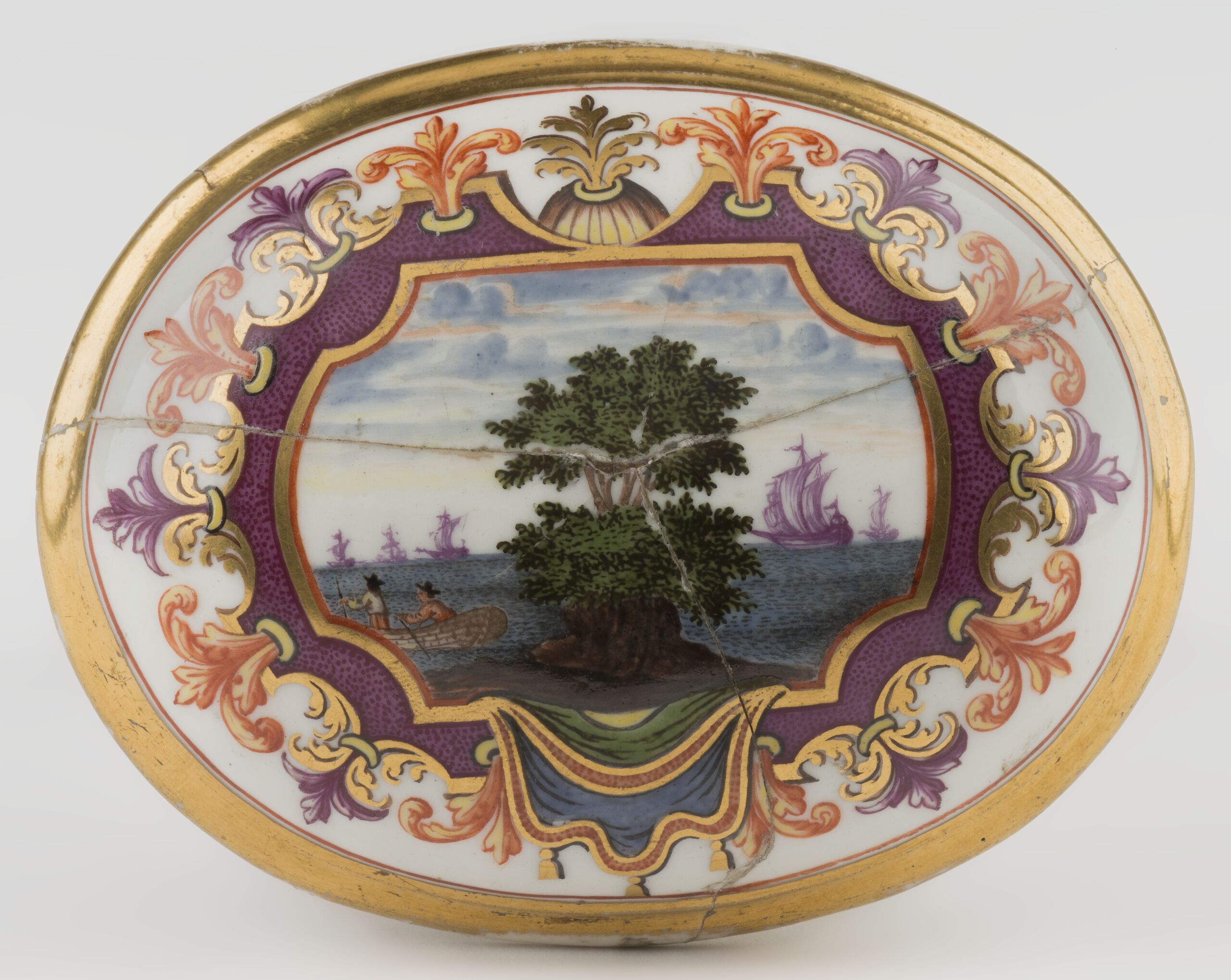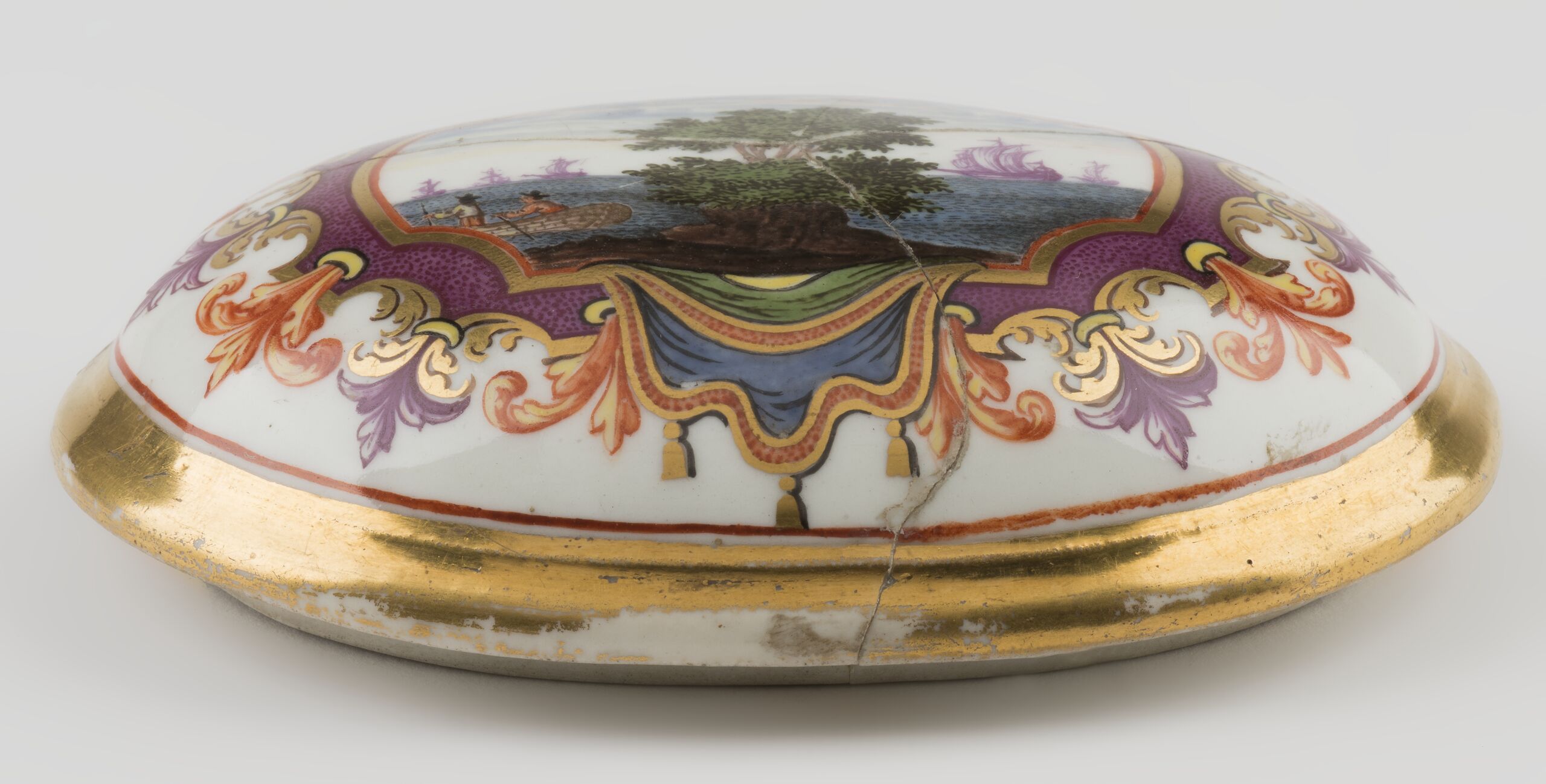 ovale Dose mit Goldrändern, Goldspitzenbordüre und farbig gemalten Blütenzweigen, flach gewölbter Deckel mit Goldrändern und einer großen violett und gold gerahmten Kartusche mit einer farbig gemalten Uferlandschaft