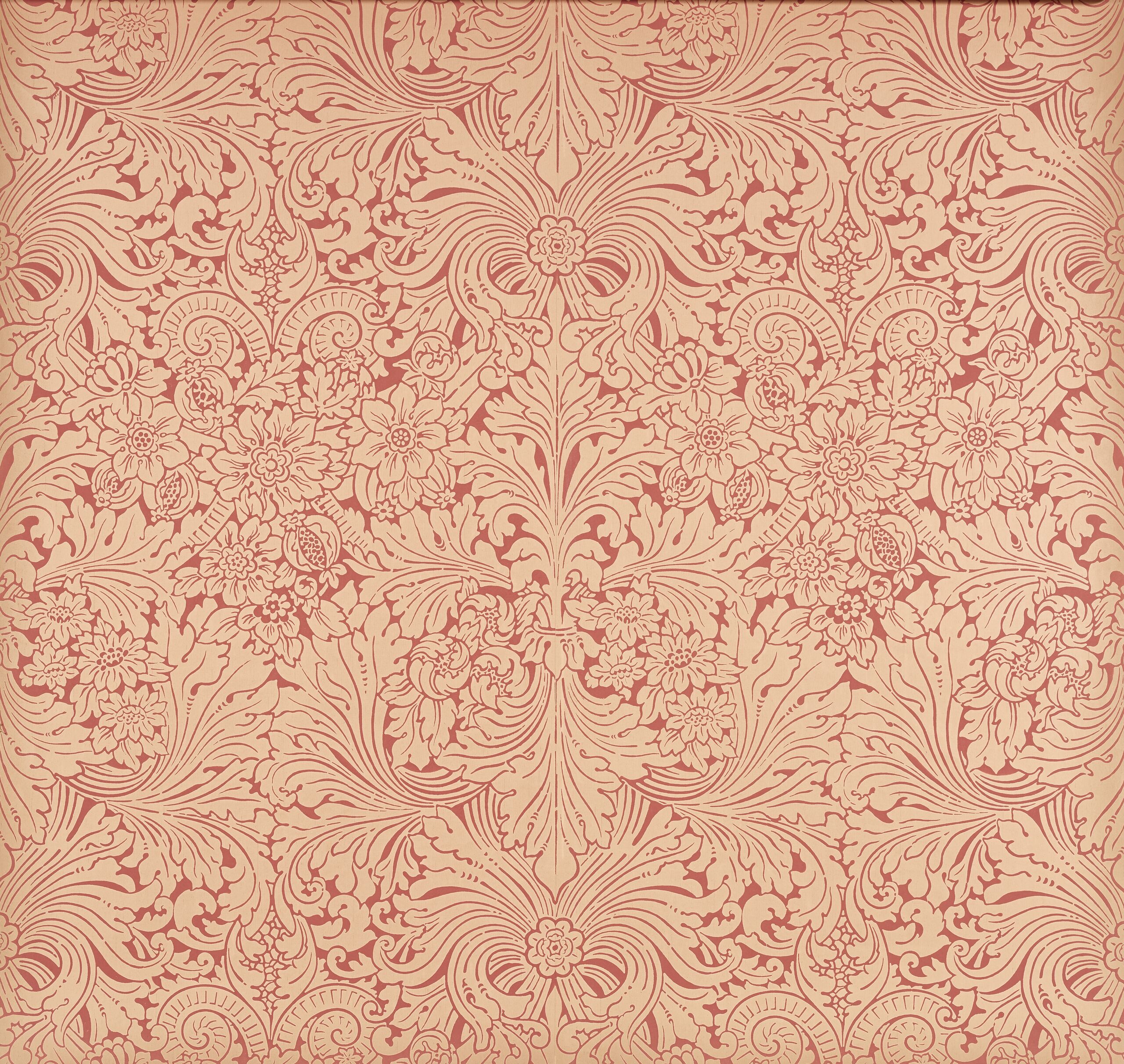 - Light red leaf and flower tendrils with horn- like, twisted ornaments, on red background (descriptive title)