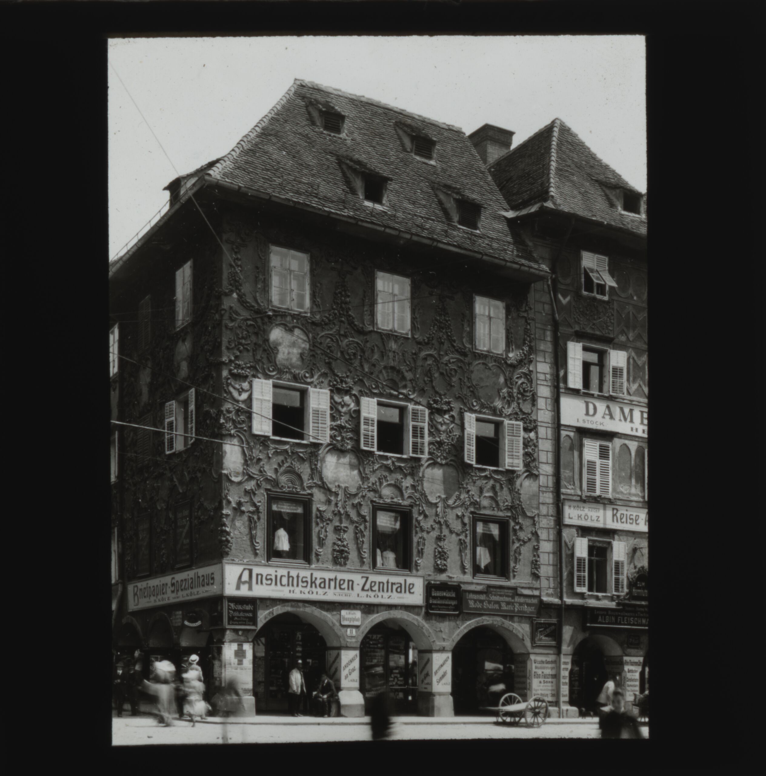- Text am Objekt: Briefpapier-Spezialhaus. [...] Ansichtskarten-Zentrale. Weinstube Delikatessen [...] Hauptplatz 11 [...] Damenwäsche Brautausstattungen [...] Lehranstalt für Schnittzeichnen und Kleidermachen. Mode-Salon Marie [...] KÖLZ [...]