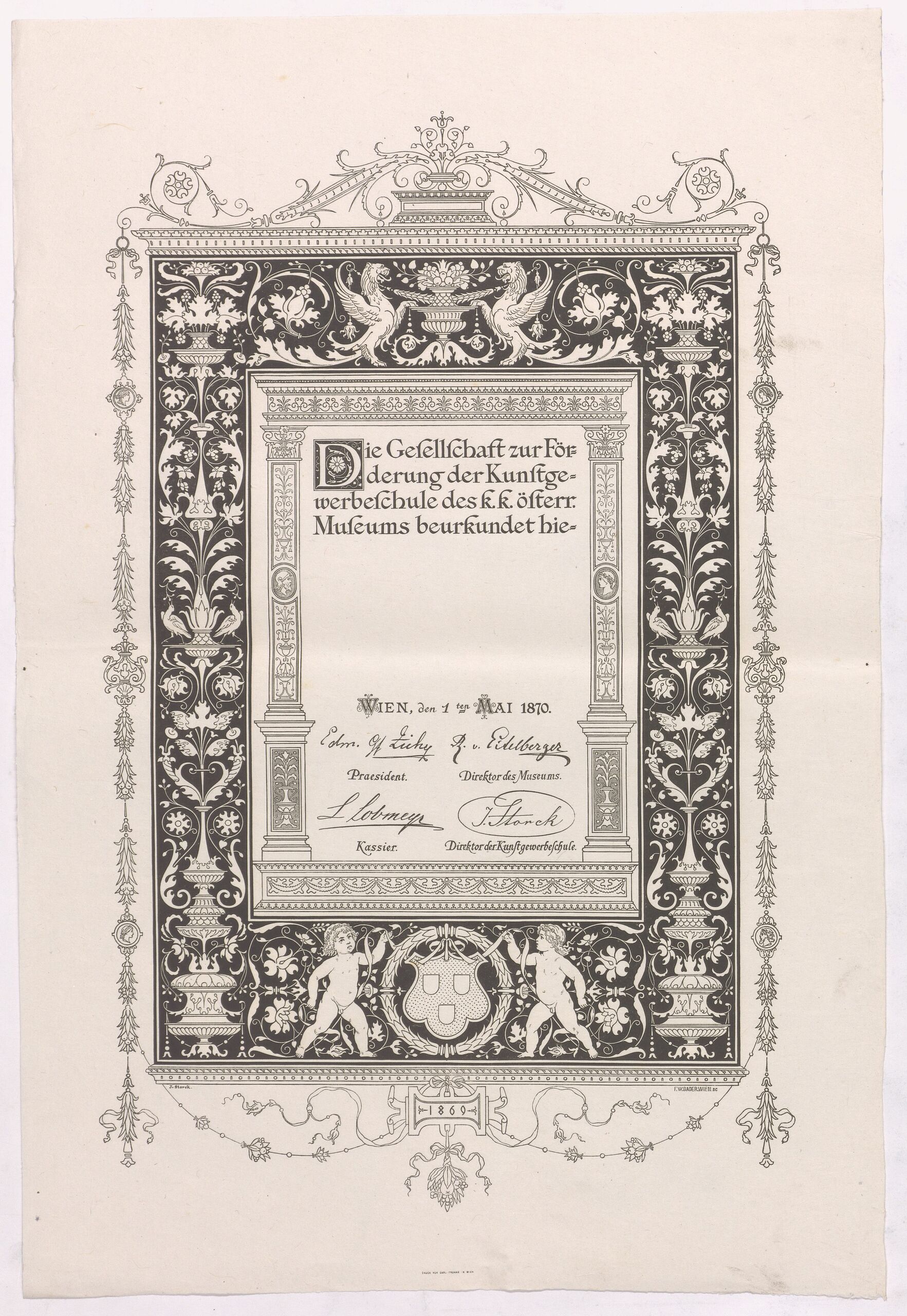 - 作品に記載されている文章: Die Gesellschaft zur För- / derung der Kunstge- / werbeschule des k. k. österr. / Museums beurkundet hie- / Wien, den 1 ten Mai 1870. / Edm. Gf. Zicky R. v. Eitelberger / Praesident. Direktor des Museums. / L Lobmeyr J. Storck / Kassier. Direktor des Kunstgewerbeschule / J. Storck / F. W. Bader Wien sc. / 1869 / Druck von Carl Fromme in Wien [gedruckter Text]