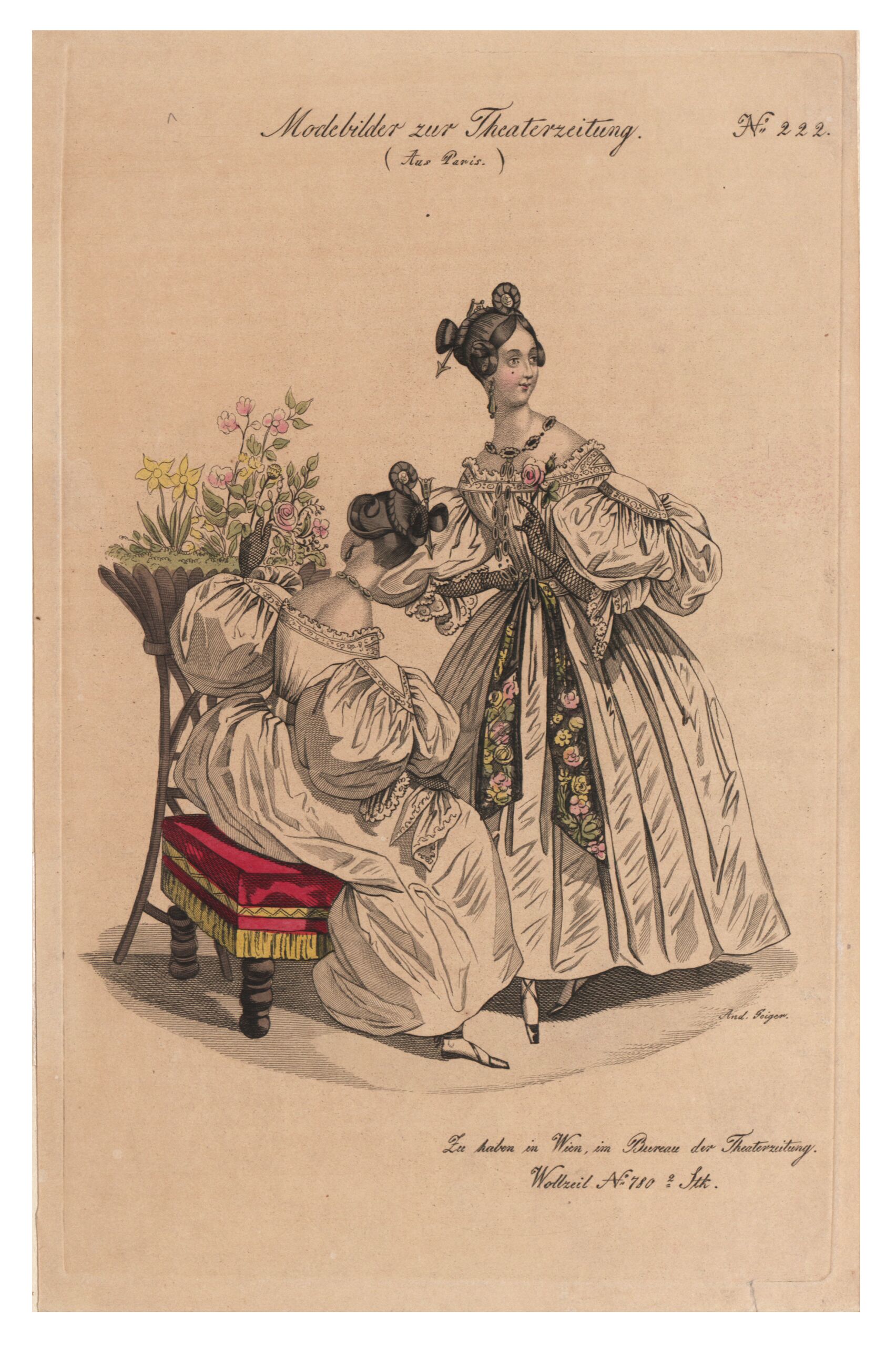 - 作品に記載されている文章: Modebilder zur Theaterzeitung. No. 222 / (Aus Paris.) / Zu haben in Wien, im Bureau der Theaterzeitung. / Wollzeil No. 780, 2t Stk.