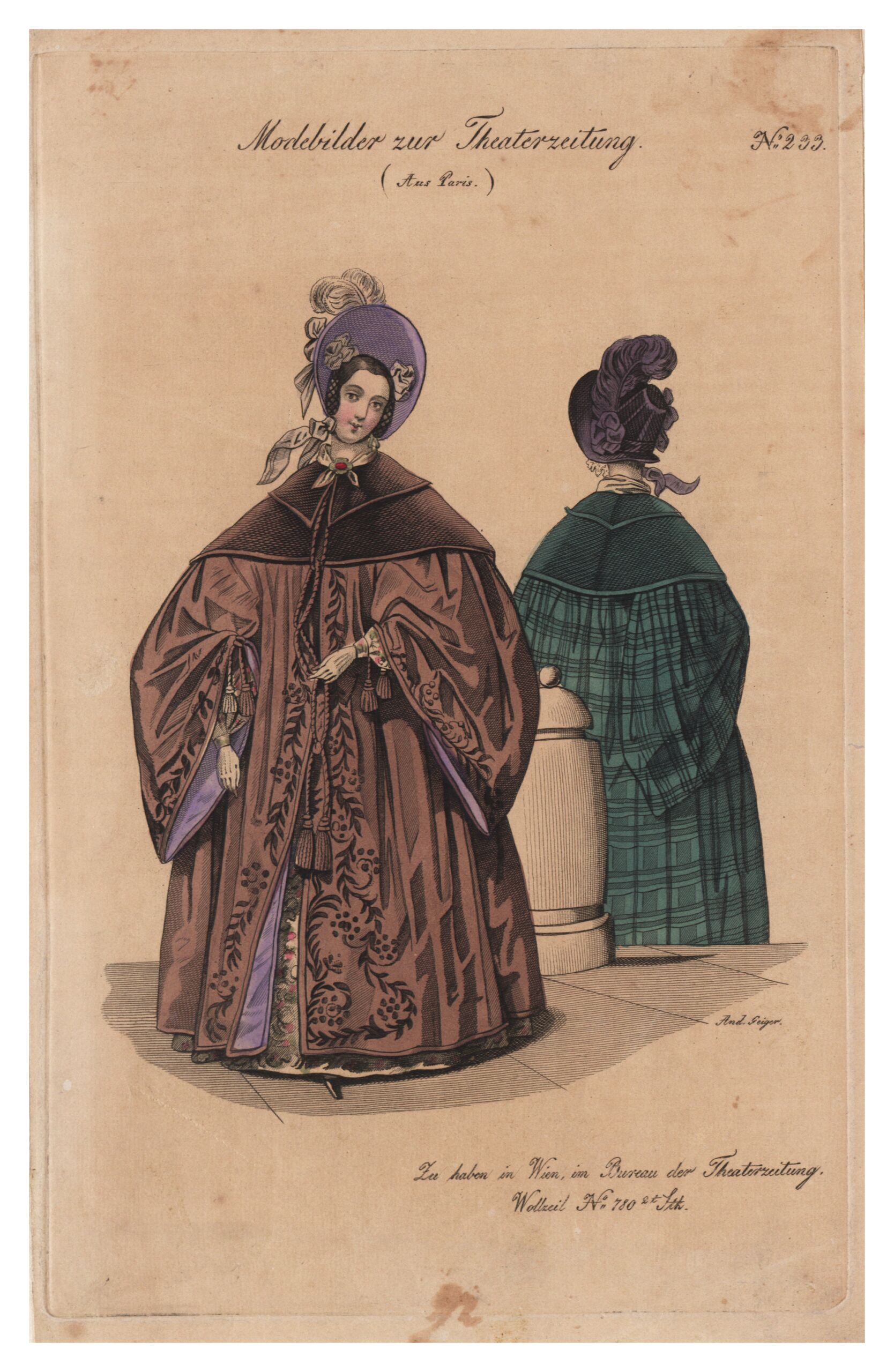 - 作品に記載されている文章: Modebilder zur Theaterzeitung. No. 233 / (Aus Paris.) / Zu haben in Wien, im Bureau der Theaterzeitung. / Wollzeil No. 780, 2t Stk.