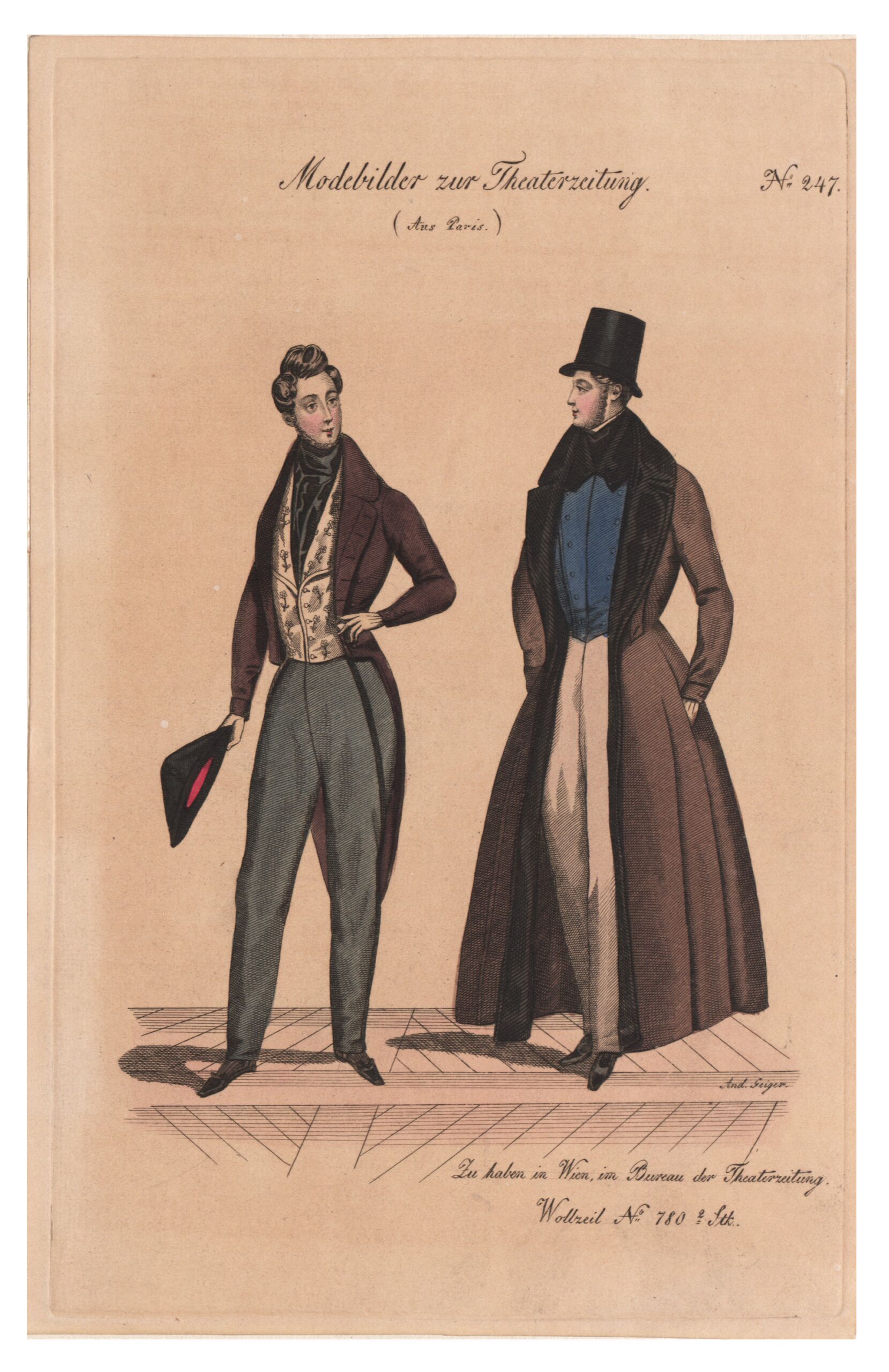 - 作品に記載されている文章: Modebilder zur Theaterzeitung. No. 247 / (Aus Paris.) / Zu haben in Wien, im Bureau der Theaterzeitung. / Wollzeil No. 780, 2t Stk.
