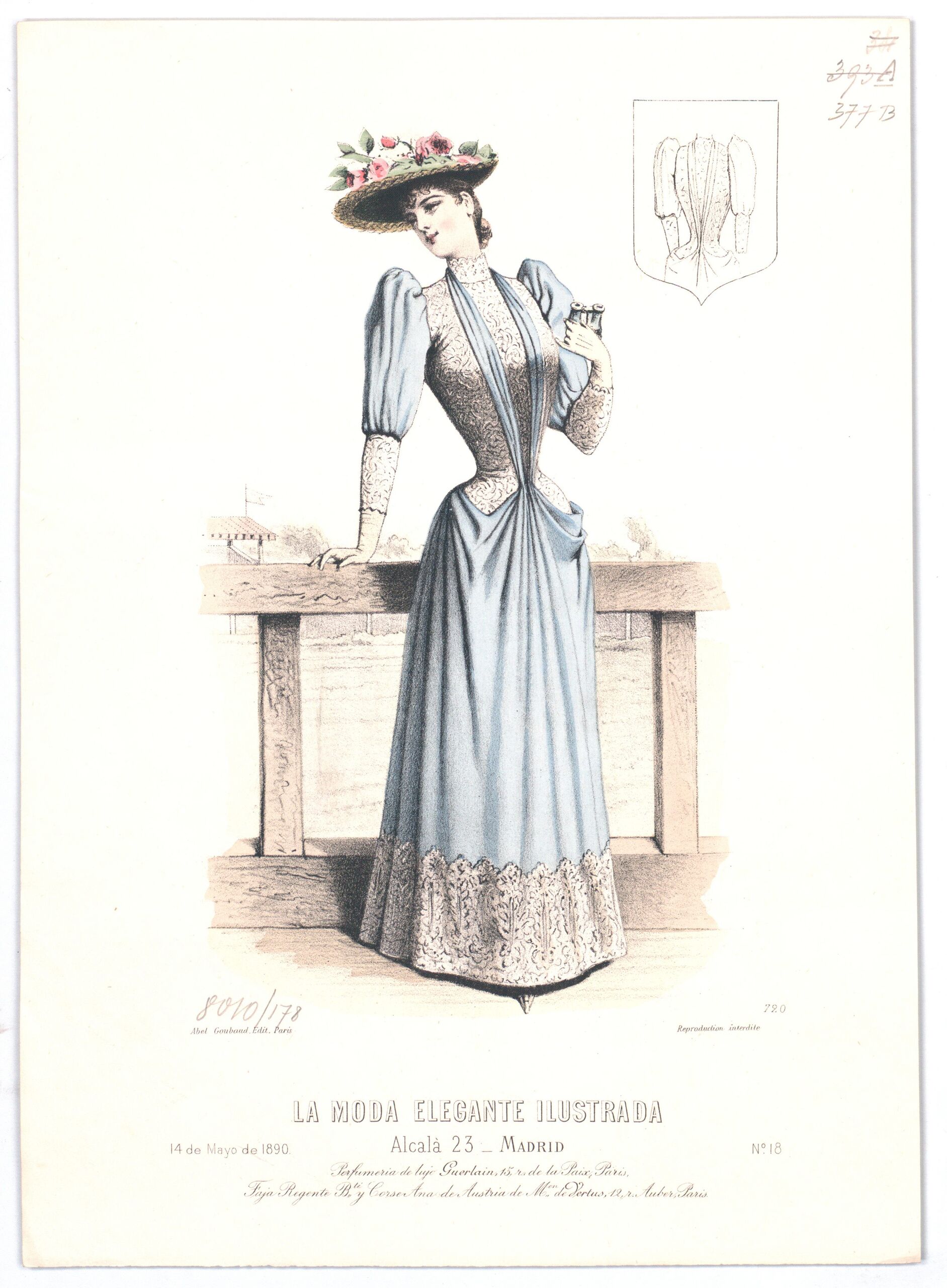 - 作品に記載されている文章: [Links unten:] Abel Goubaud, Edit. Paris / 14 de Mayo de 1890. [Unten in der Mitte:] LA MODA ELEGANTE ILUSTRADA / Alcalà 23_Madrid / Perfumeria de lujo Guerlain, 15, r. de la Paix, Paris, / Faja Regente Bté. y Corse Ana de Austria de Mon. de Vertus, 12, r. Auber, Paris. [Rechts unten:] 720 / Reproduction interdite / No. 18 [Gedruckter Text]