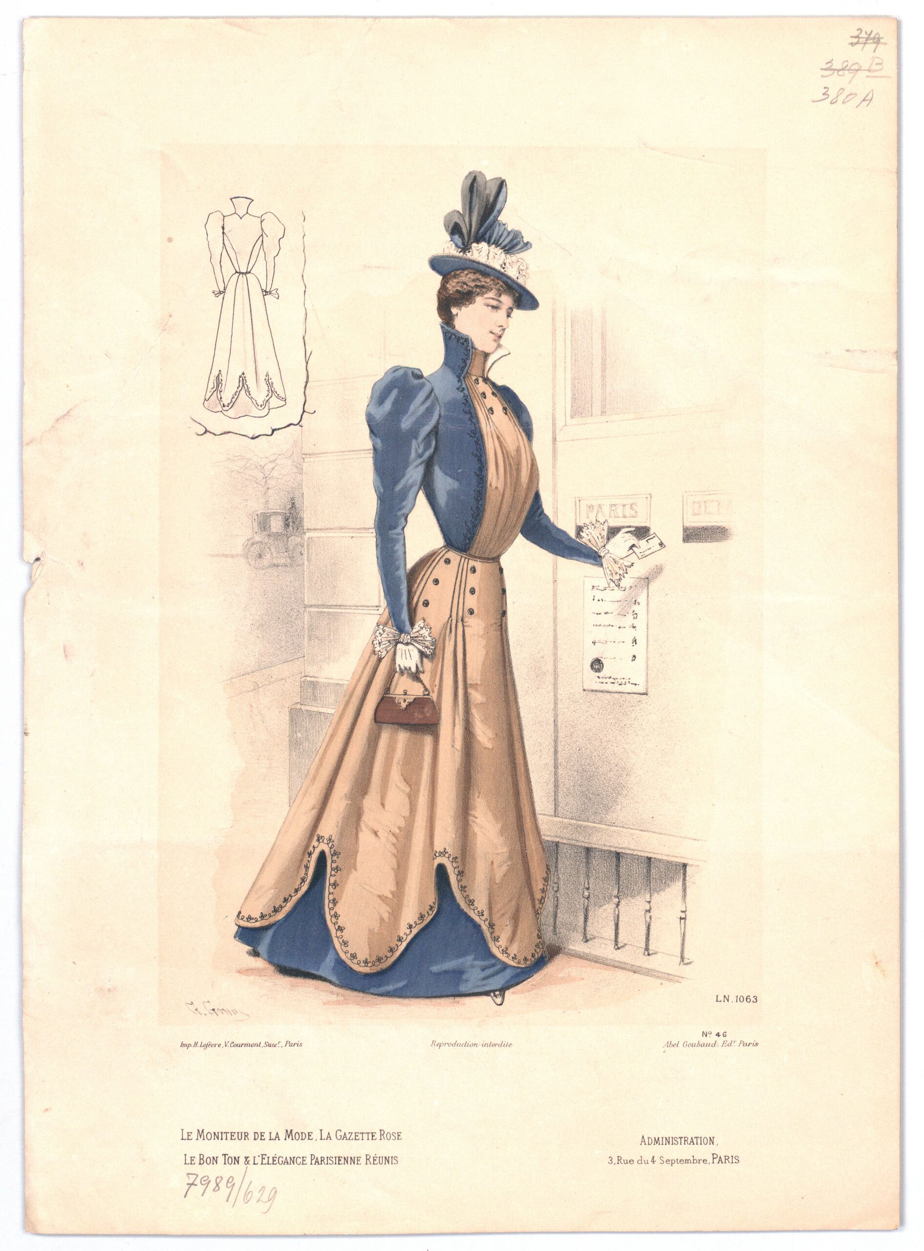 - 作品に記載されている文章: G. Gonin; LN. 1063; Imp. H. Lefévre, V. Courmont, Succ.r, Paris; Reproduction Interdite; N° 46 1896 / Abel Goubaud Ed. Paris; Le Moniteur de la Mode, la gazette rose / le bon ton & l'elégance parisienne réunis; Administration, / 3, Rue du 4 Septembre, PARIS
